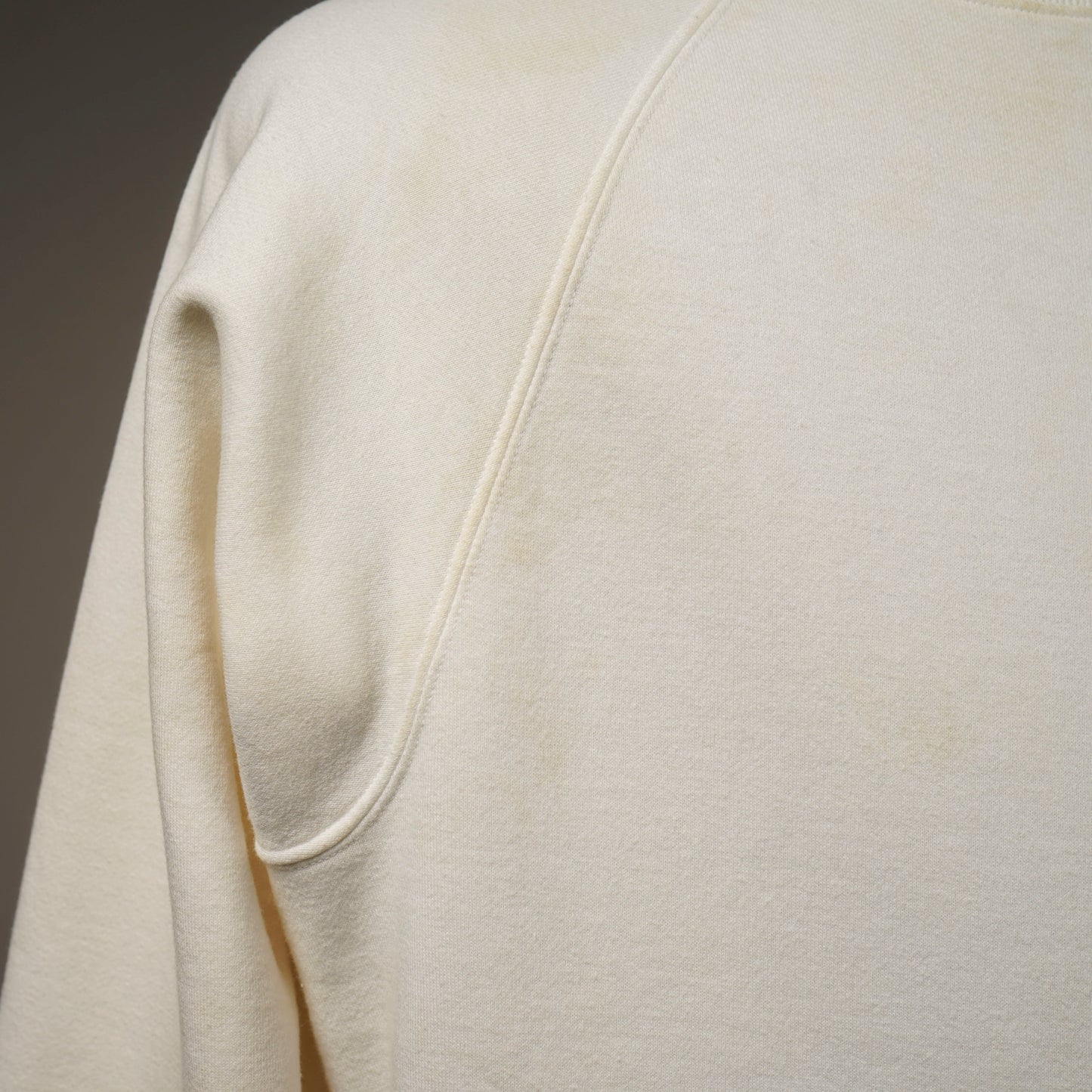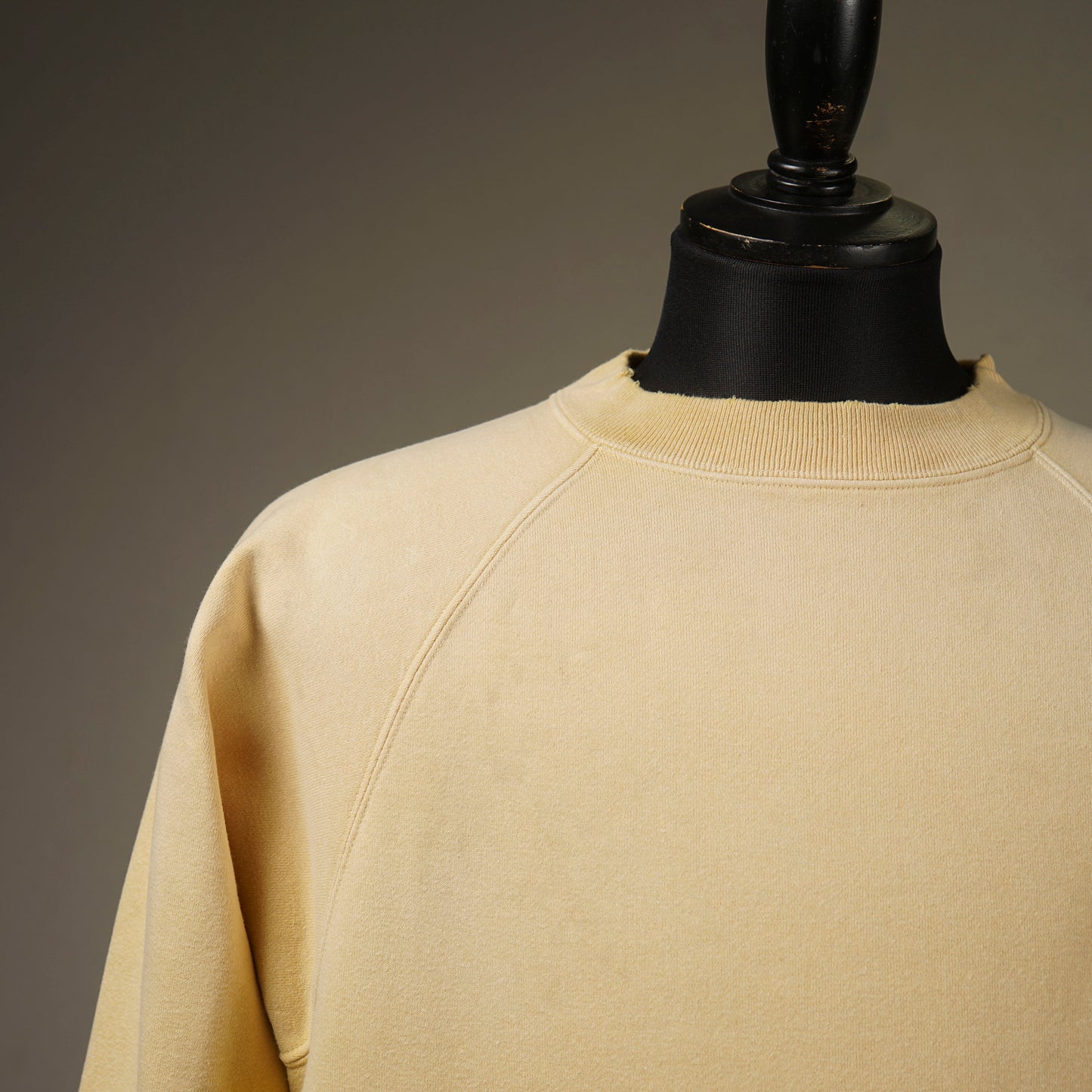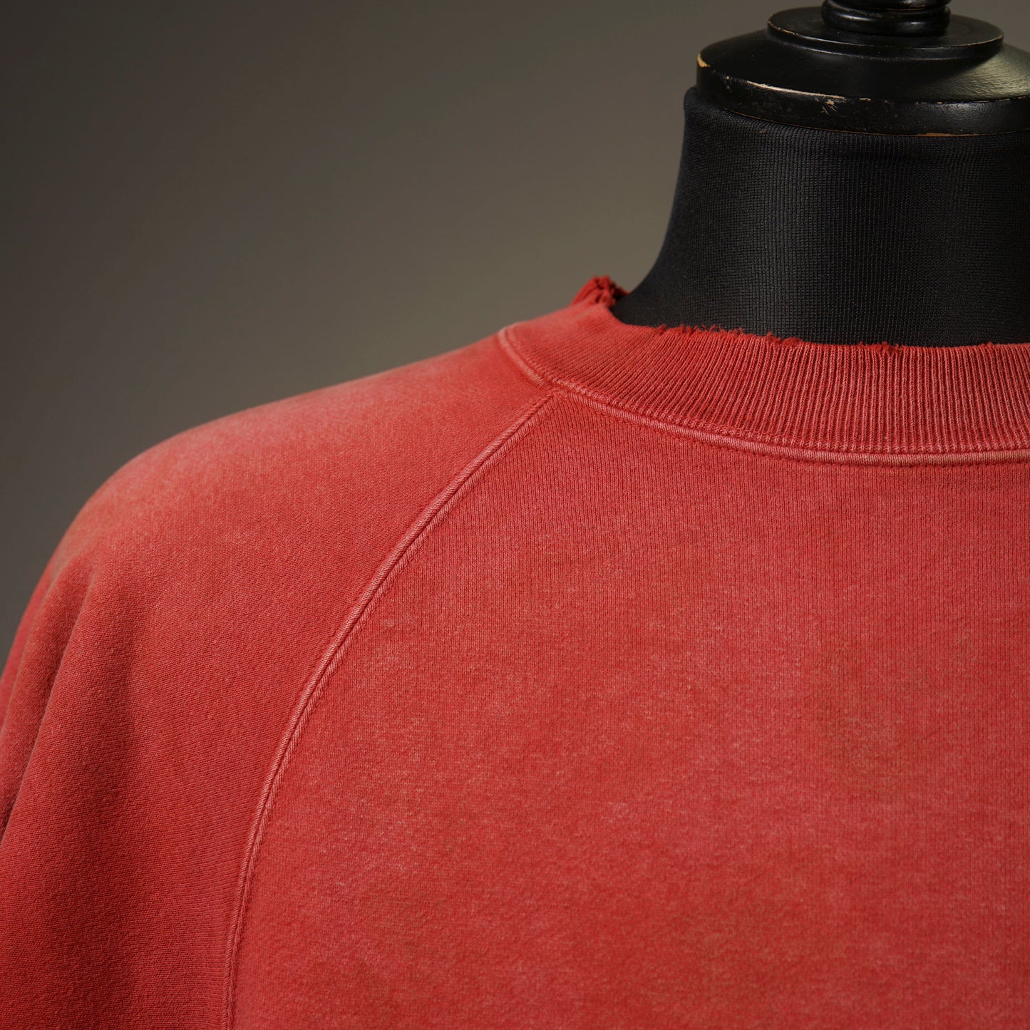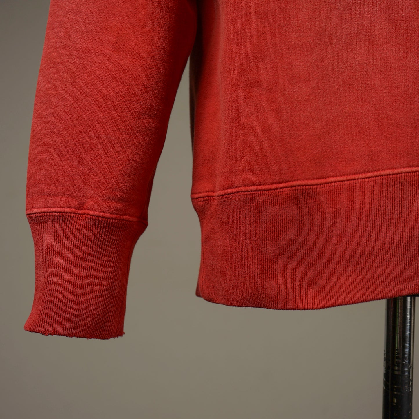 70年代の希少な丸胴旧式の小寸編機で編み立て、特殊な起毛機で開かずに丸胴のまま先に起毛を施しております。XLサイズは特注の編み機を使用し、ヴィンテージではなかったビックサイズの物を実現。更に旧式ウインス機で時間をかけ高温で晒して洗い込み乾燥工程も大型タンブラーを使用し、手間暇を掛けて仕上げた大変風合いの良い生地に仕上がっております。