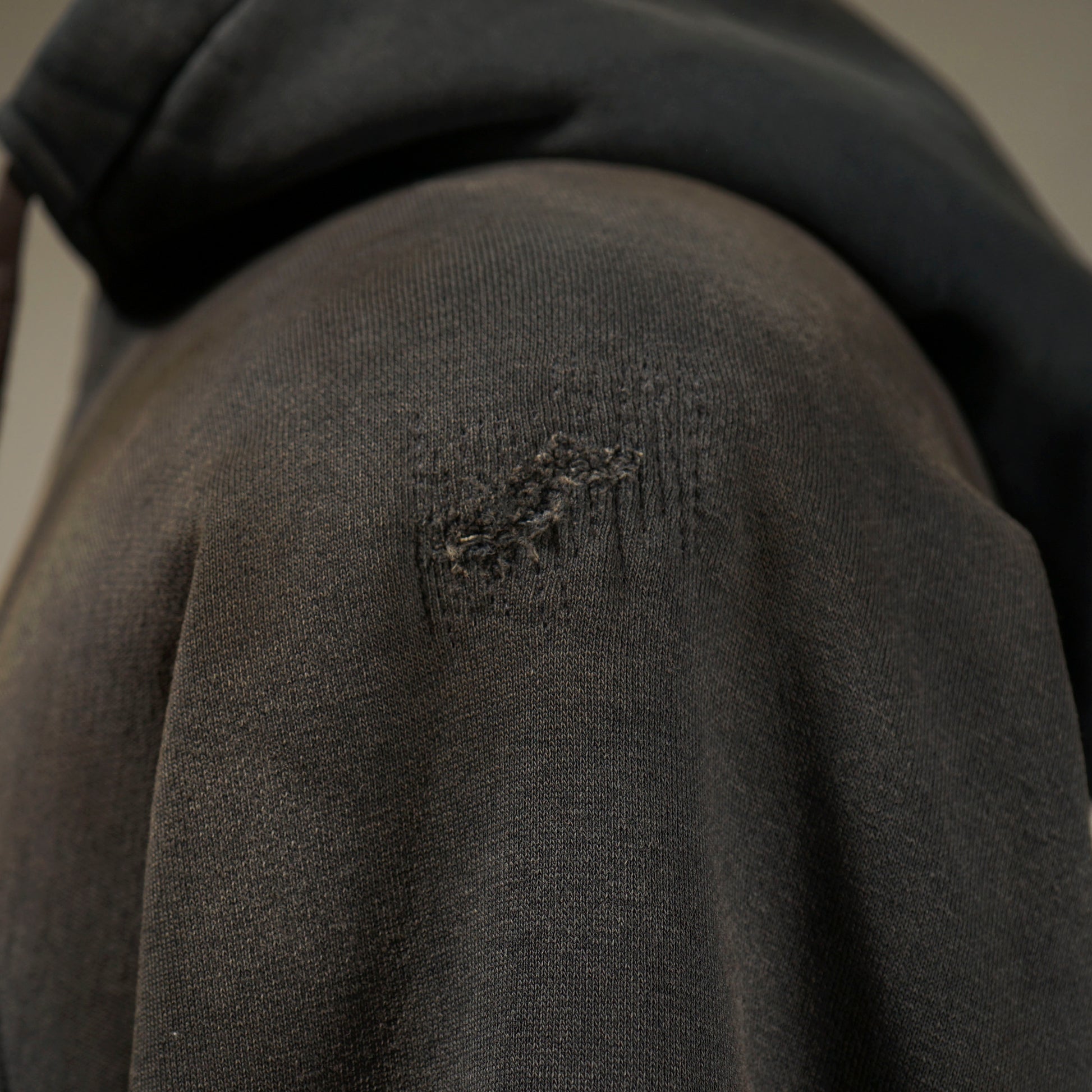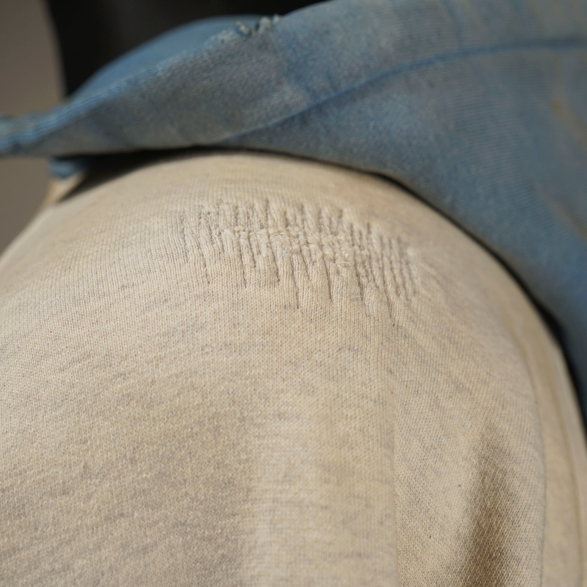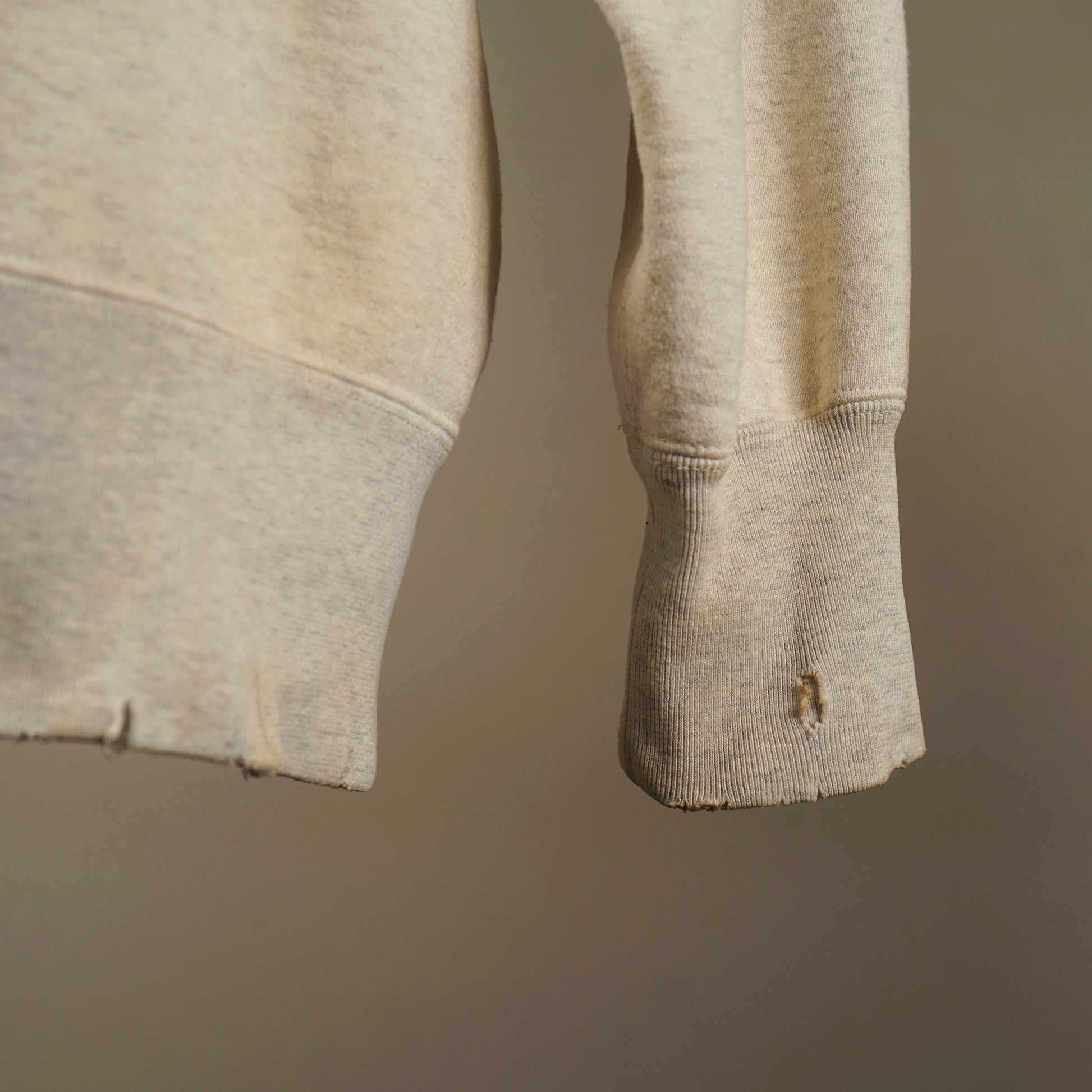70年代の希少な丸胴旧式の小寸編機で編み立て、特殊な起毛機で開かずに丸胴のまま先に起毛を施しております。XLサイズは特注の編み機を使用し、ヴィンテージではなかったビックサイズの物を実現。更に旧式ウインス機で時間をかけ高温で晒して洗い込み乾燥工程も大型タンブラーを使用し、手間暇を掛けて仕上げた大変風合いの良い生地に仕上がっております。