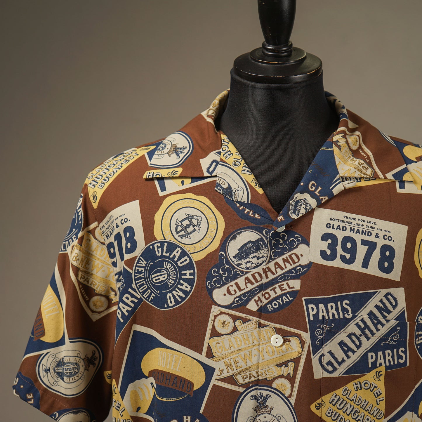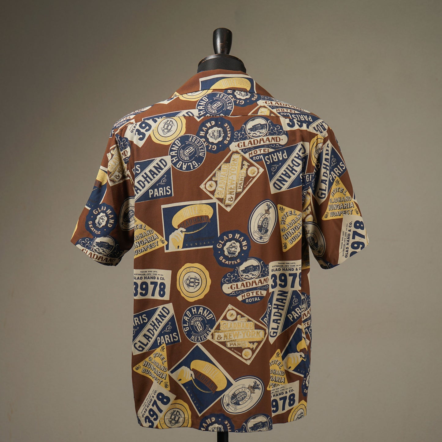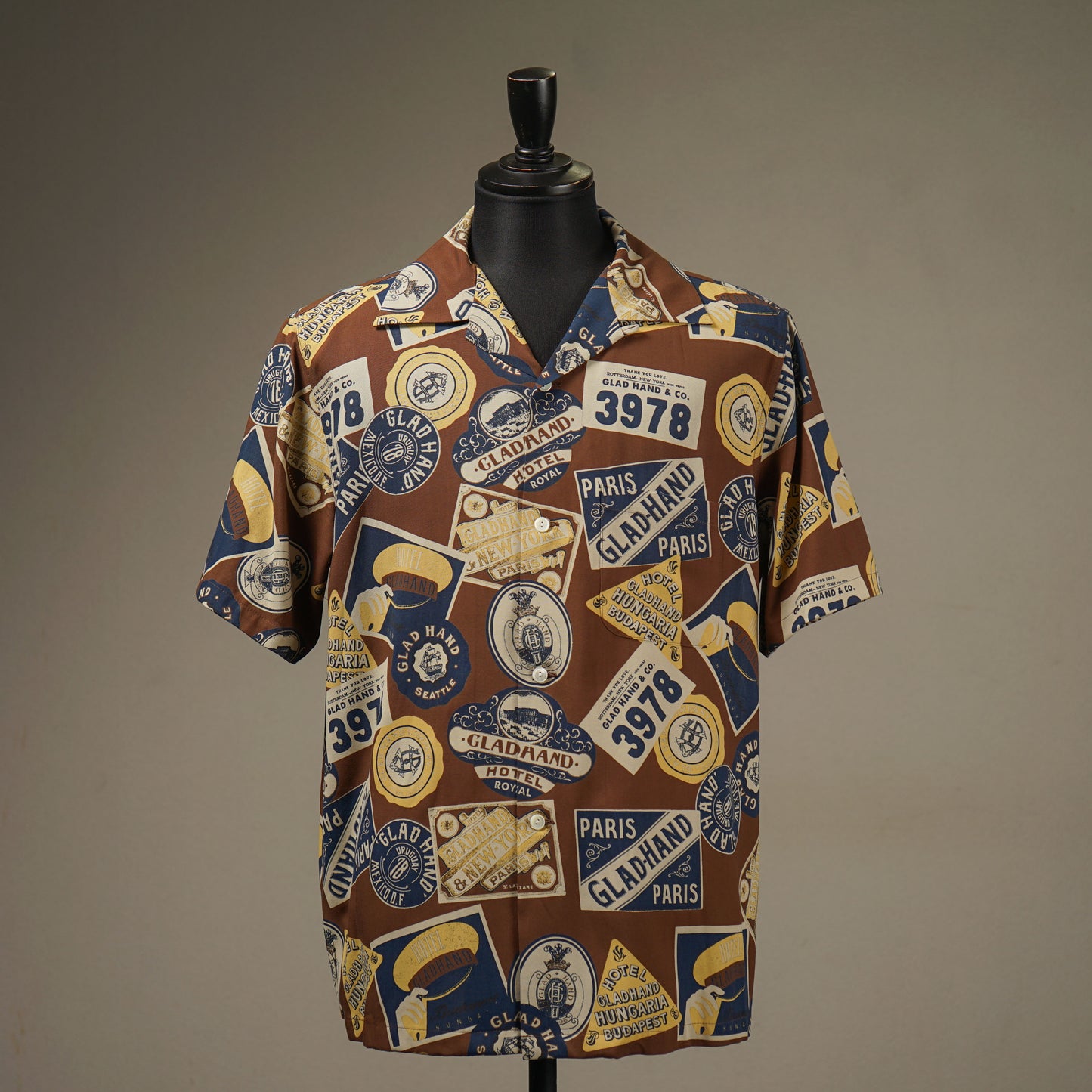世界中を旅するGLOBE-TROTTERをテーマにしたグラッドハンドオリジナルのレーヨンブロード生地を使用した、ゆったりめのボックスシルエットシャツ。