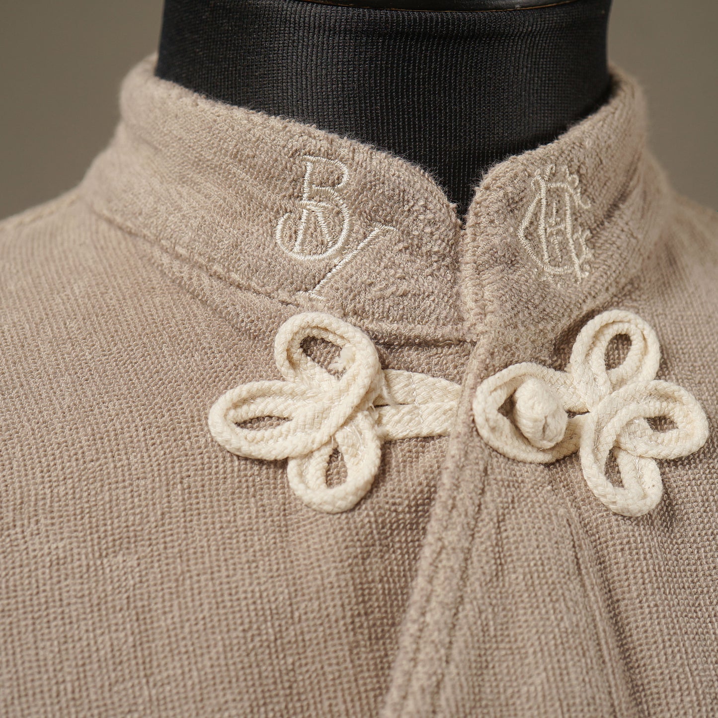 アシンメトリーのフロントにチャイナ仕様のトグル釦で、スタンドカラーの首元に配した刺繍がポイントです。