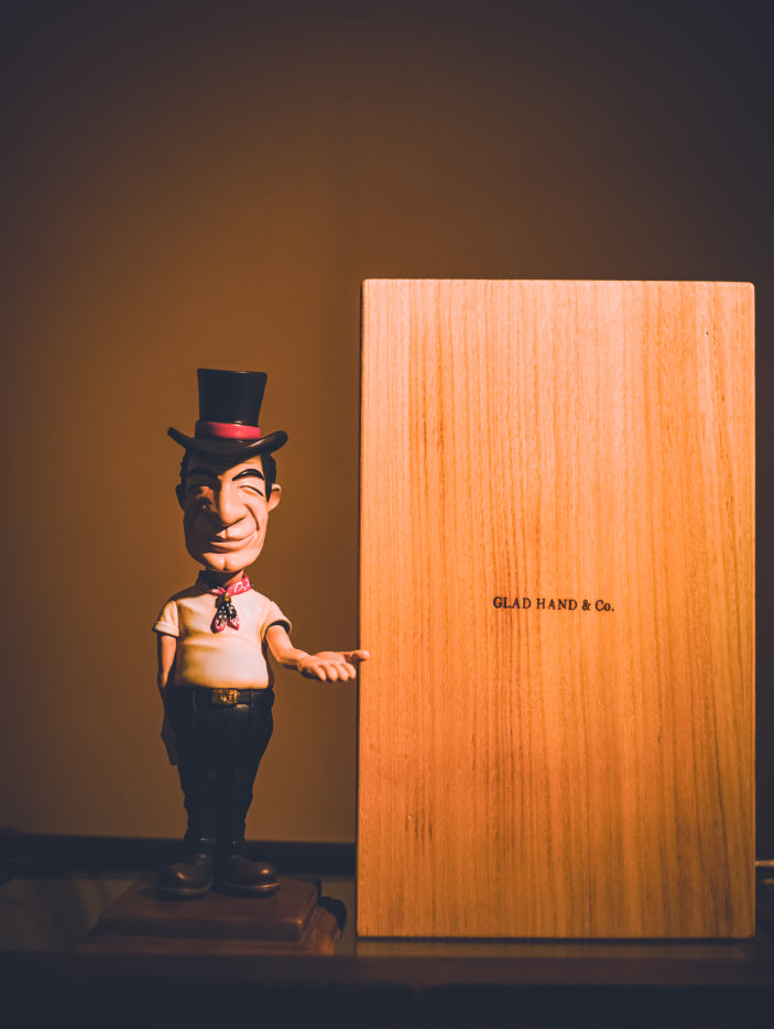 GLADHANDの物語を紡ぎ、その歴史を表現するノスタルジックで愛嬌のある存在としてデザイン。 敬意と感謝を込めた紳士的な佇まいは、「古き良き時代の世界観を現代へと昇華させる」というコンセプトを体現し、 U.S.A.COTTONを象徴する糸を手にすることでGLADHANDとお客様との絆や繋がりを表現している。