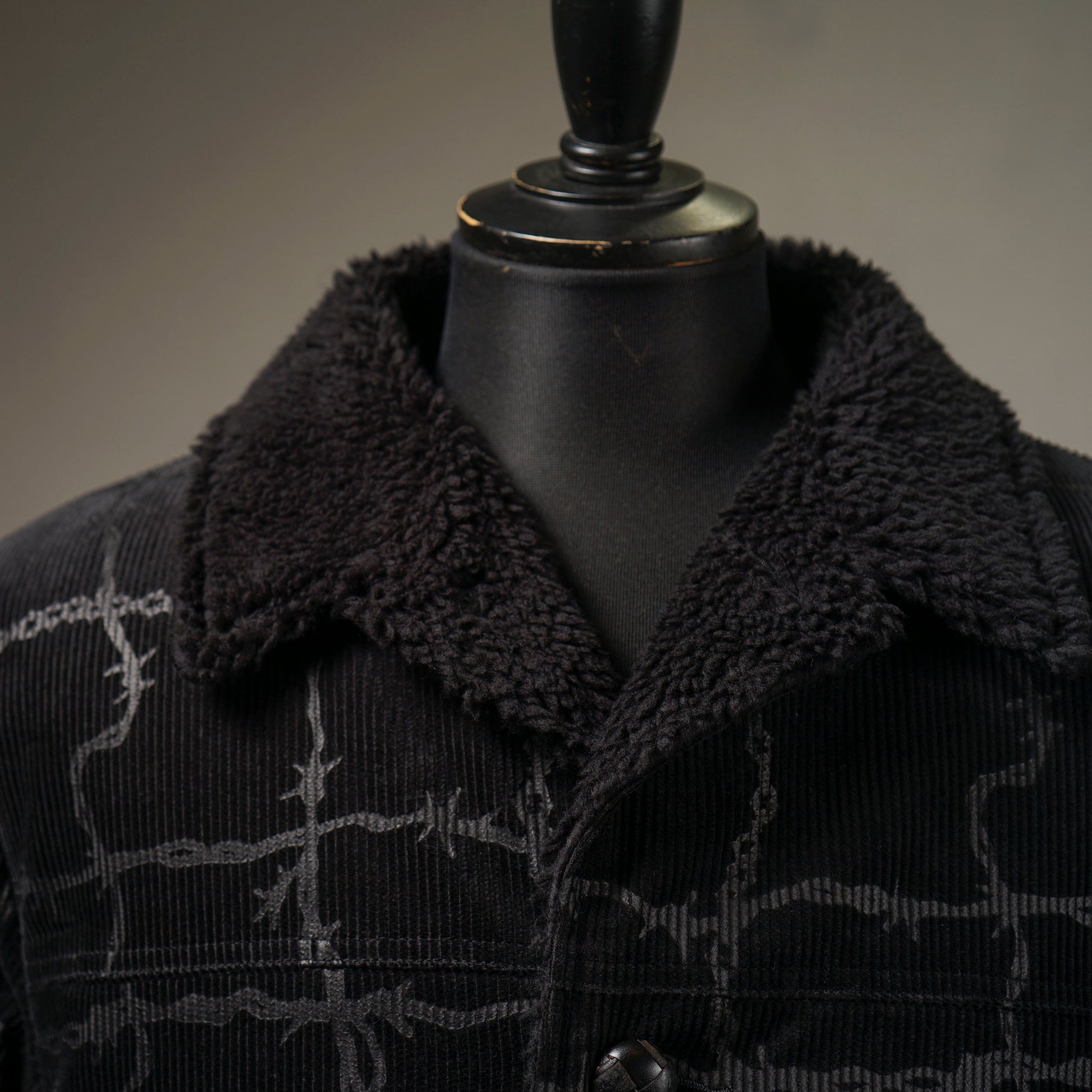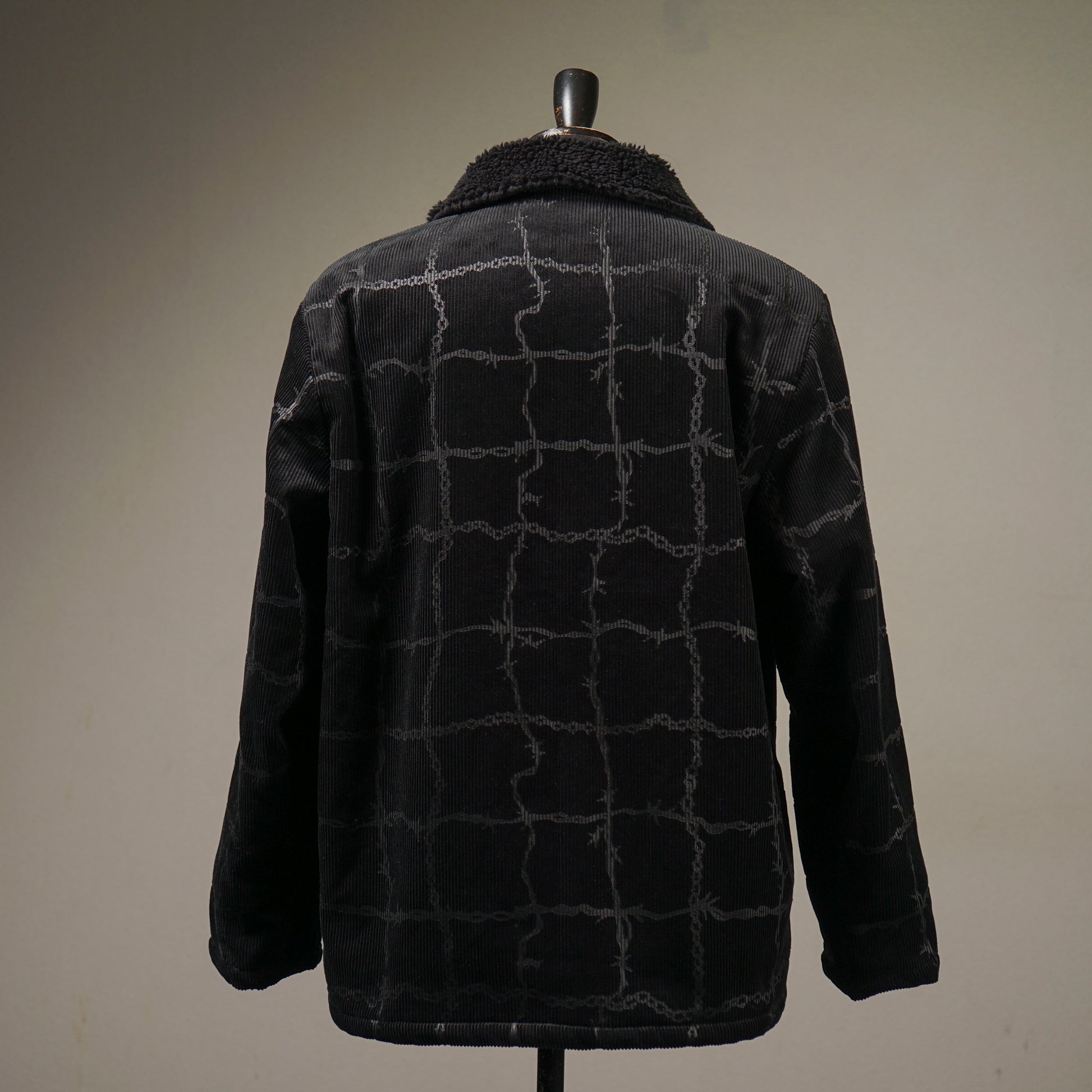 そのランチコートに、かつて反逆者やアウトサイダーが好んで彫ったヴィンテージのチェーンや有刺鉄線のタトゥーデザインを全面に施し、アンダーグランドな雰囲気とどこか上品さを兼ね備えたアイテム。