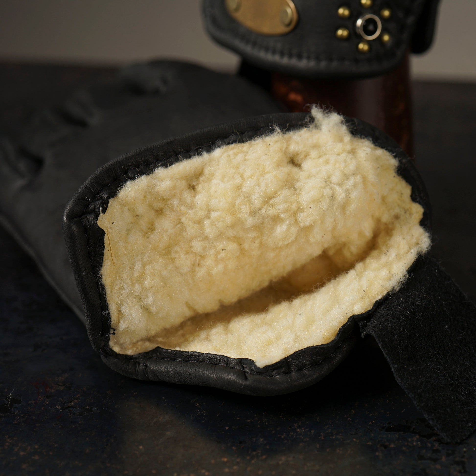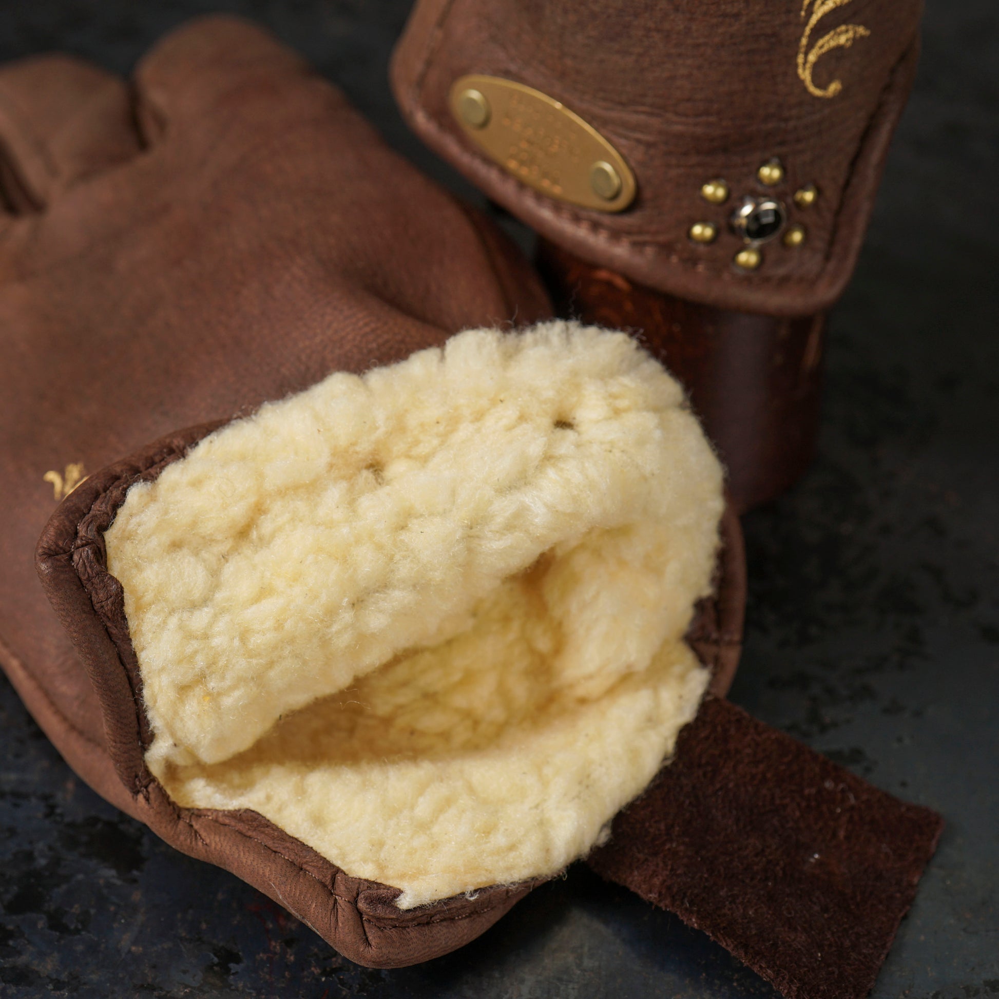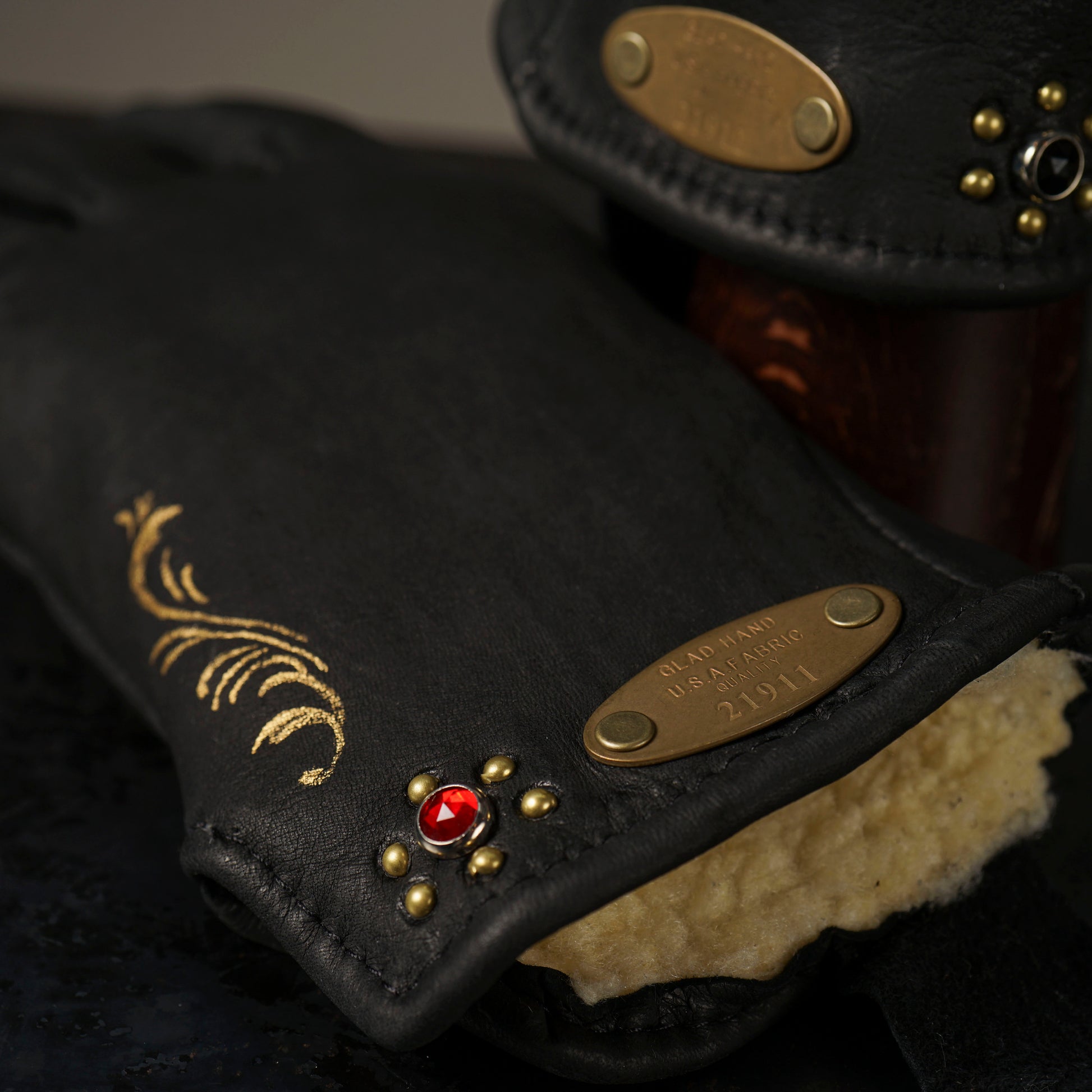 アメリカ国内での生産を続けるGeier Glove Companyのラインナップのボア付きディアスキングローブをベースに、ラインストーンを交えたフラワーモチーフのHTCスタッズを施し、オリジナルDOG TAGとGLADHANDらしいゴールドリーフのハンドペイントを施したグローブ。