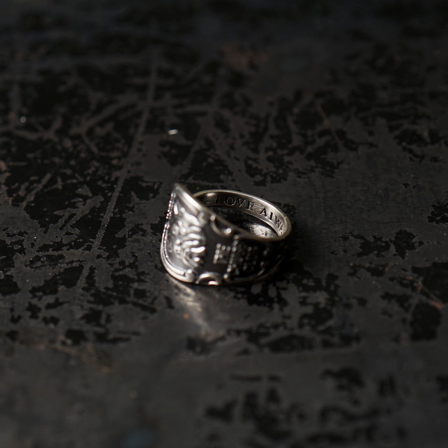 スプーンを曲げたデザインのリング、15号サイズをベースに作成しており、前後+/-5~6号程のフリーサイズ仕様になっています。