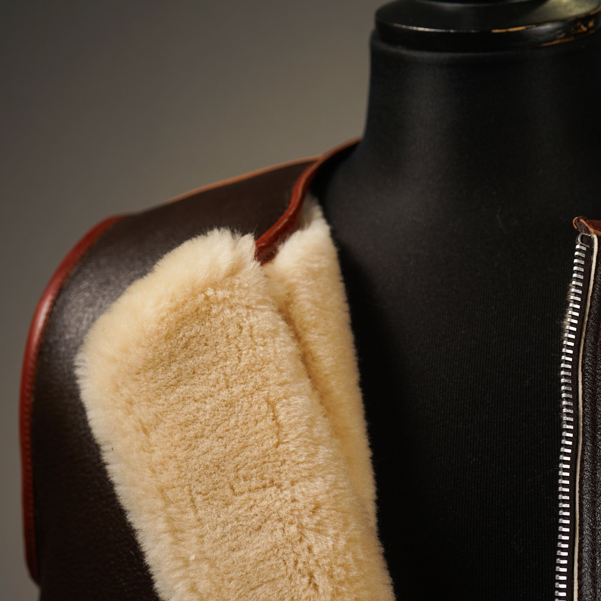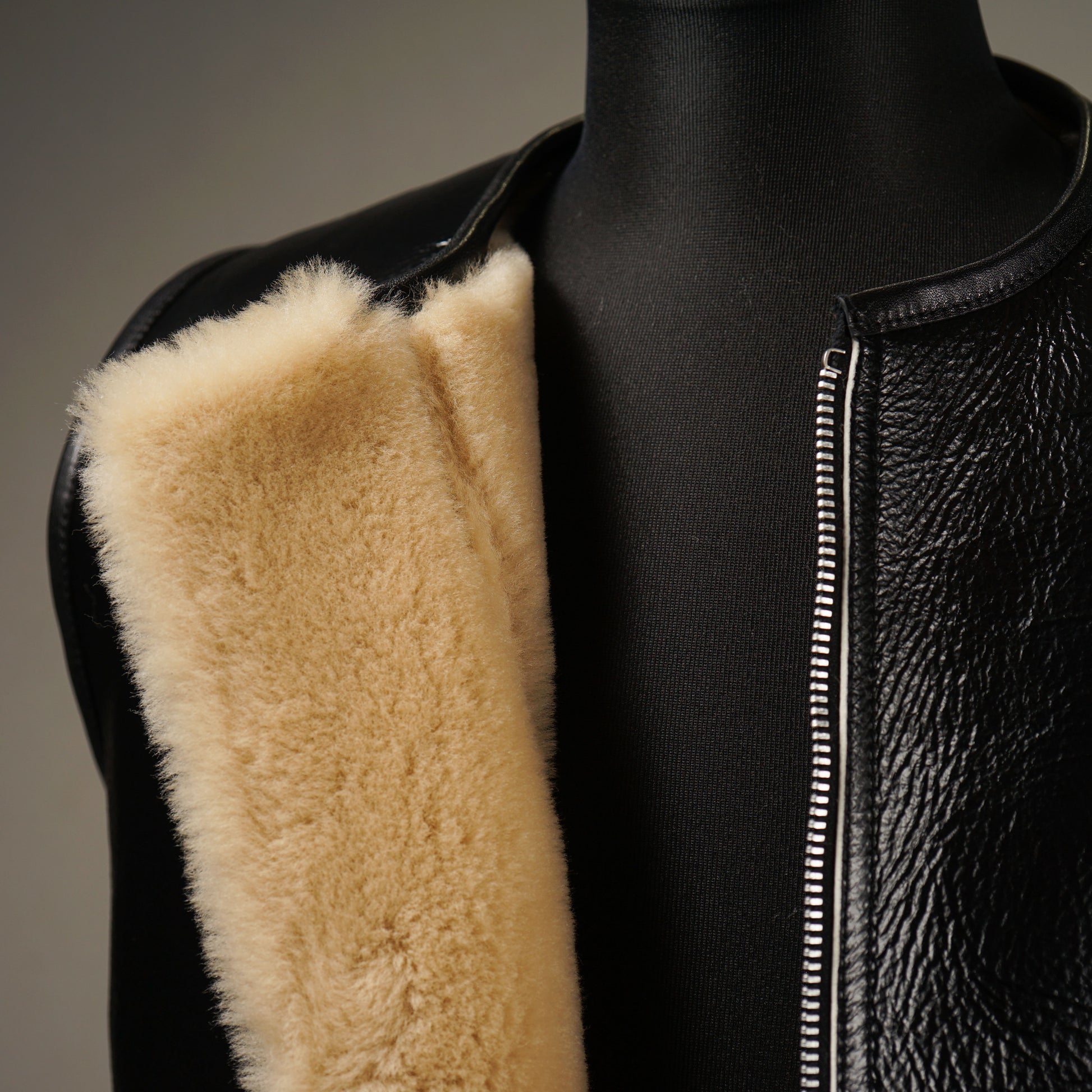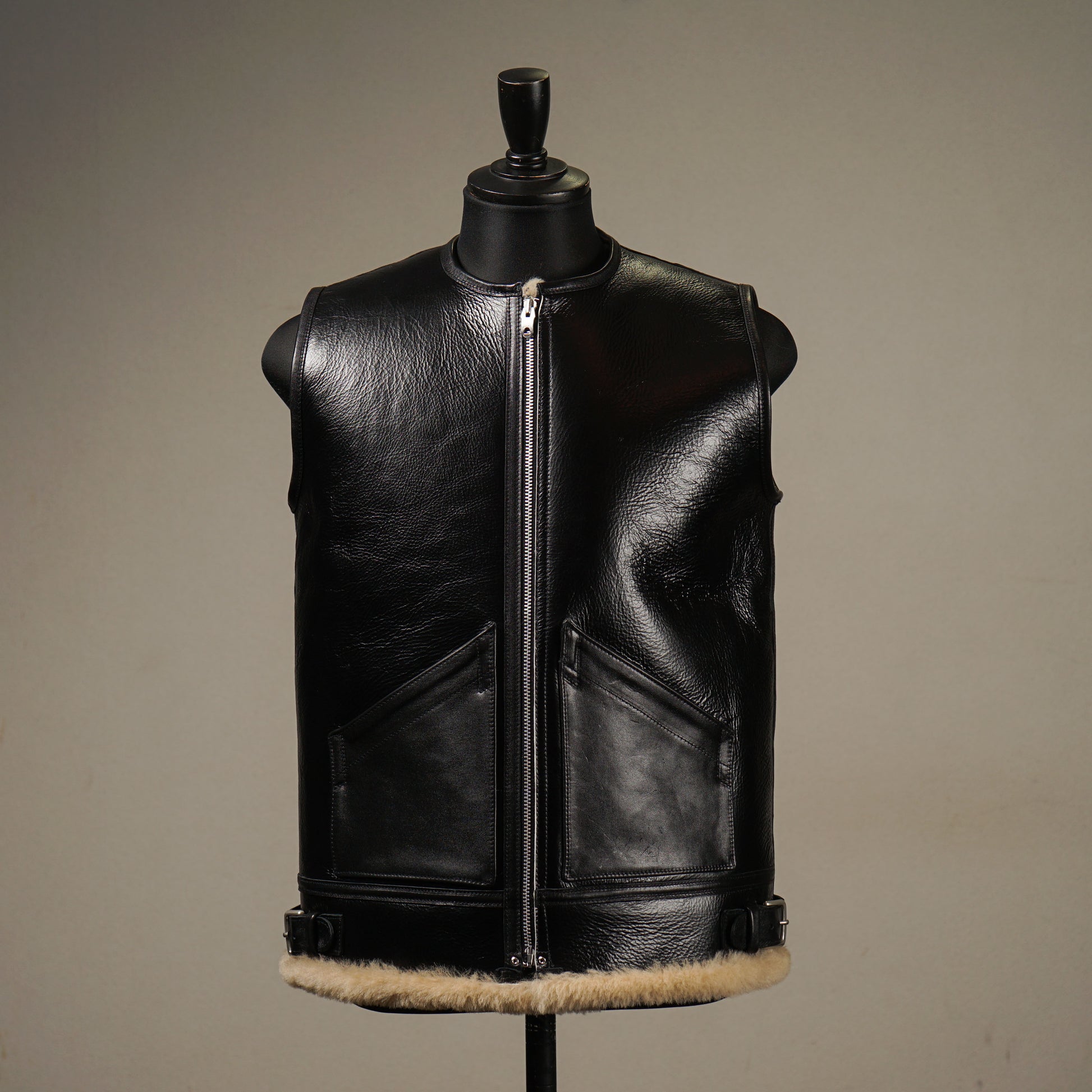 US FLIGHT JACKETをVESTにアレンジ。豪快かつ厚みあるアメリカ産のムートンで仕上げました。
