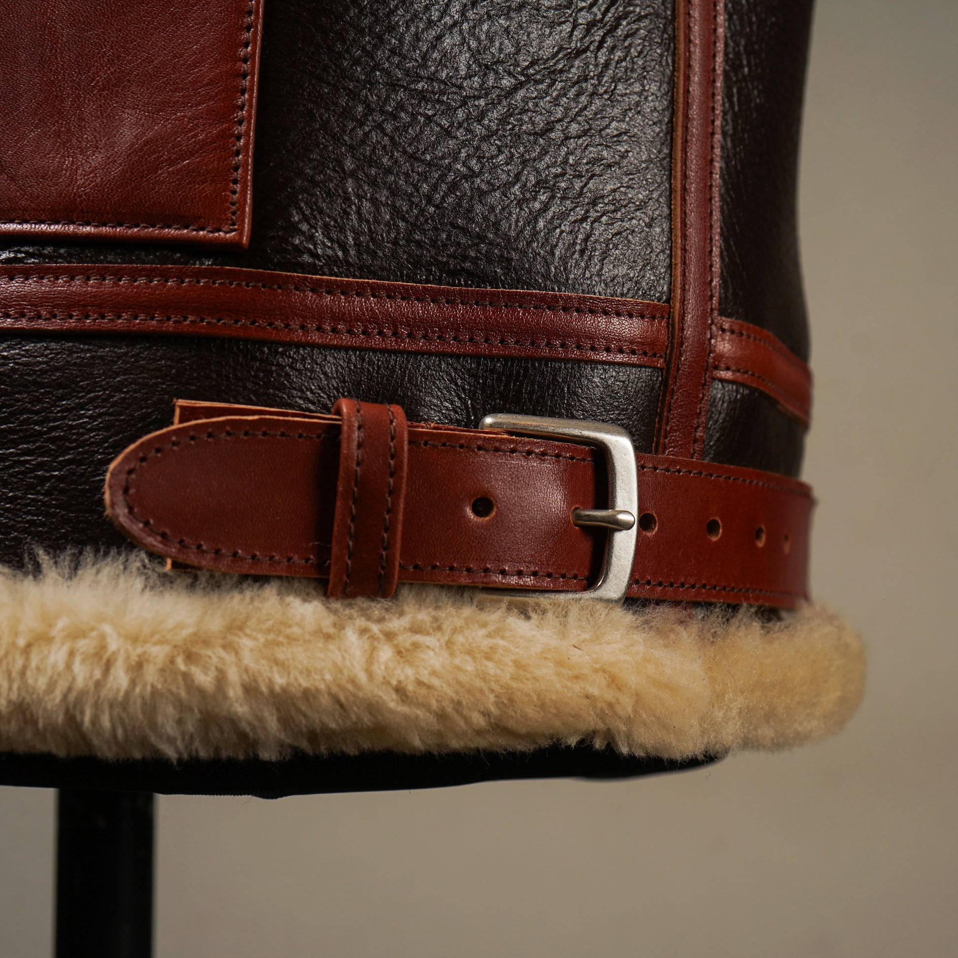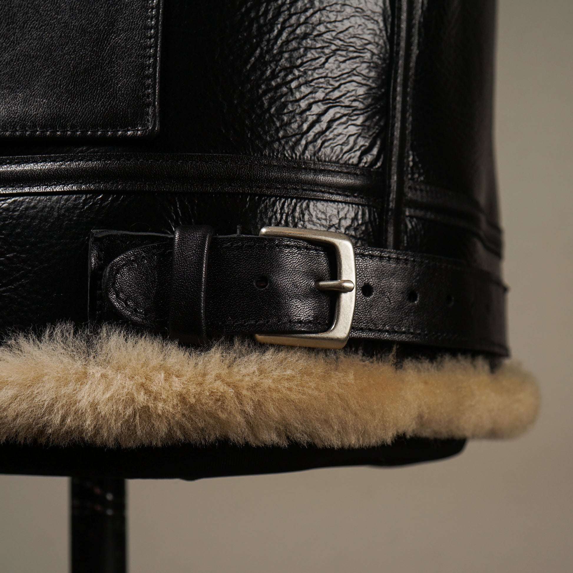 防寒性を高める為、持ち出し部分もムートンを使用。裾部分はサイドアジャスターベルトで調整可能に。レザー部分使いにはホースハイドを使用。