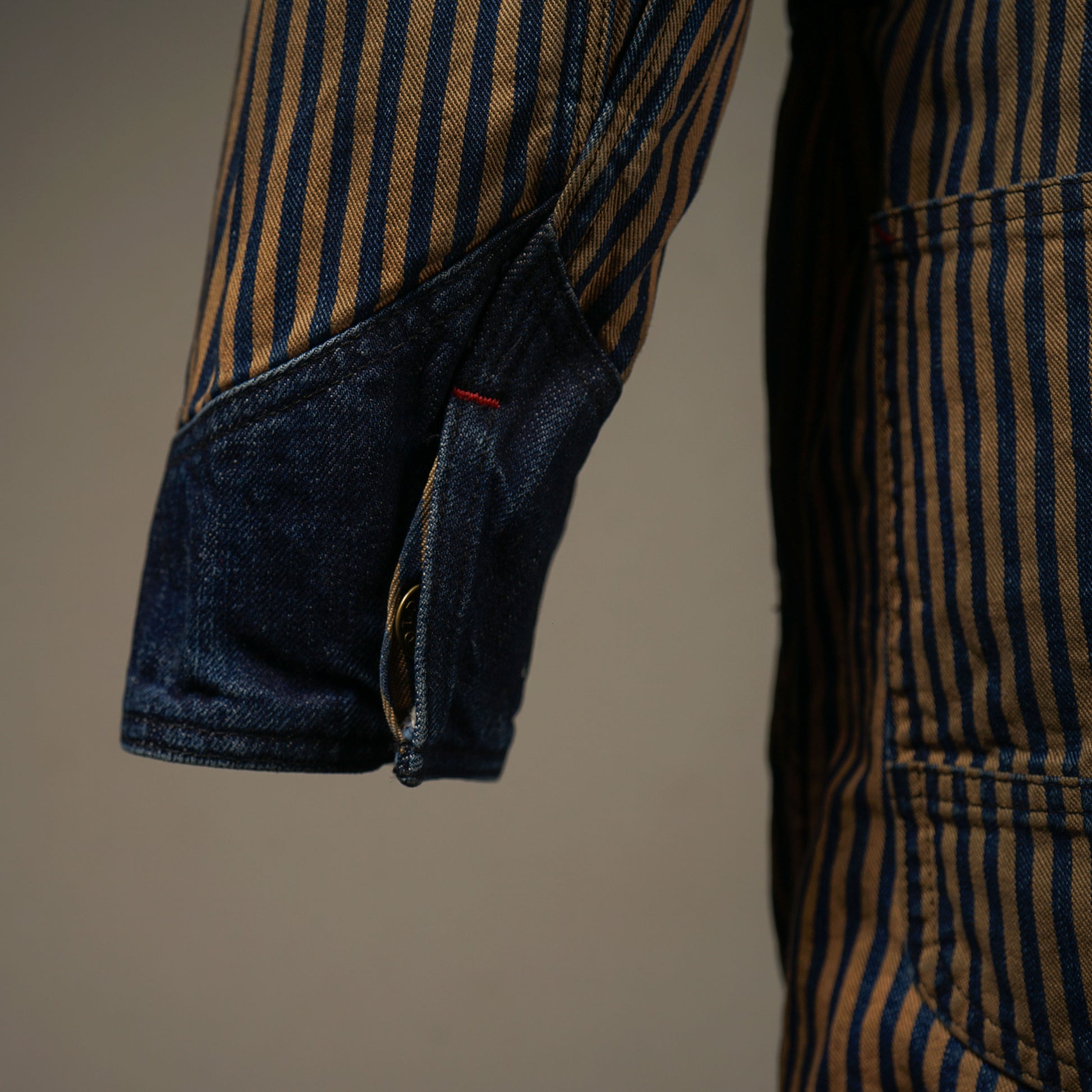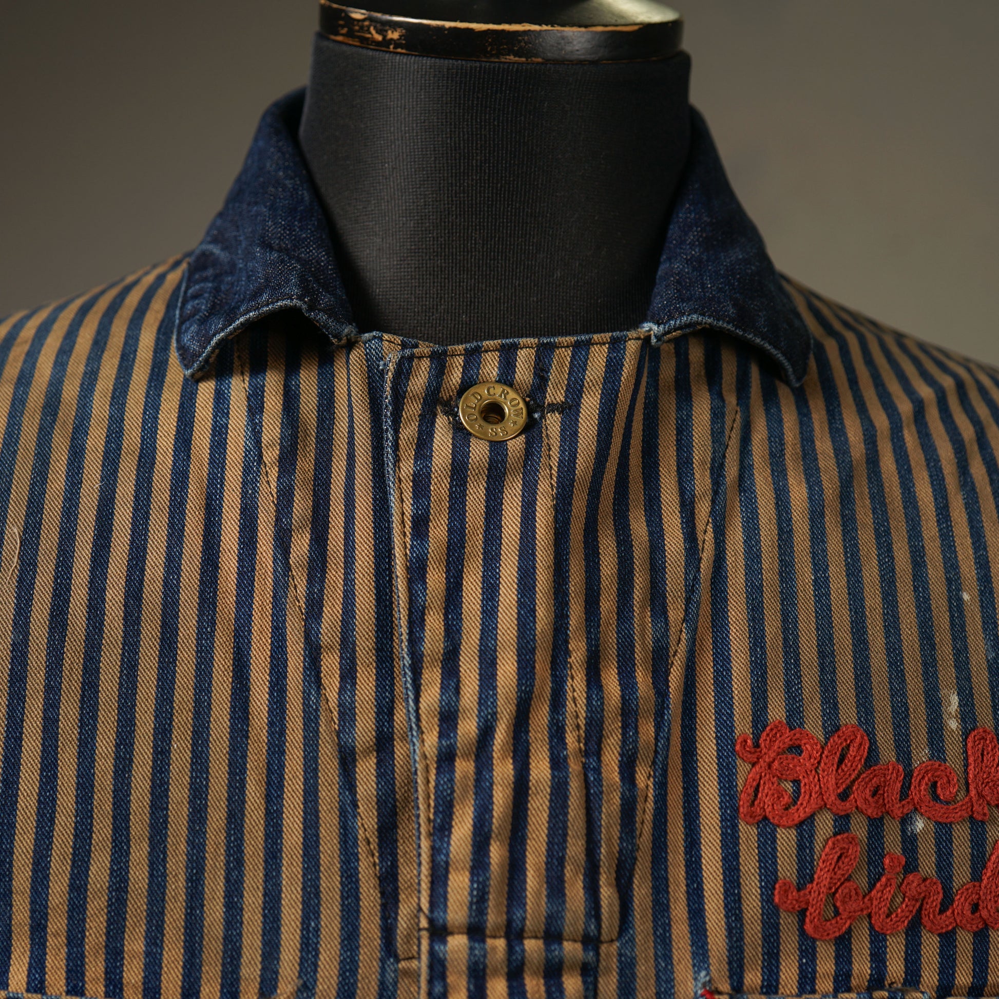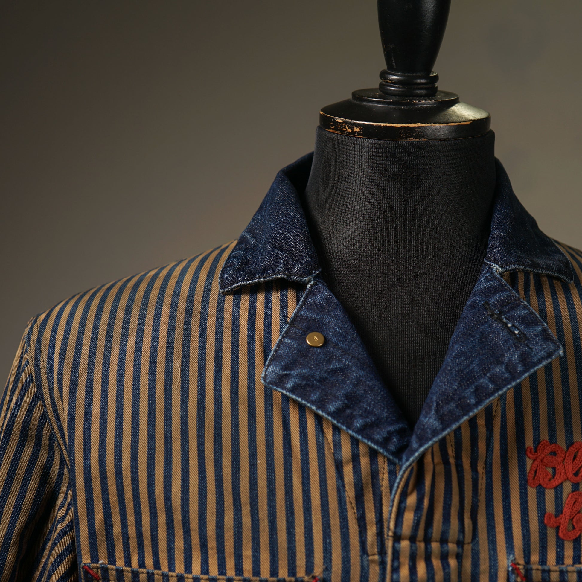 ワークウェアらしくゆとりを持たせたサイズ感で、背面のアクションプリーツや、作業時に釦が邪魔にならないように配慮した比翼仕様、補強布を底面にあてがった大きめのヒップポケットや、ツールポケットなどワークウェアらしいディテールが特徴で、デニムを部分使いした2トーンと、前後のチェーン刺繍や配色のカンヌキがアクセントとなっている。
