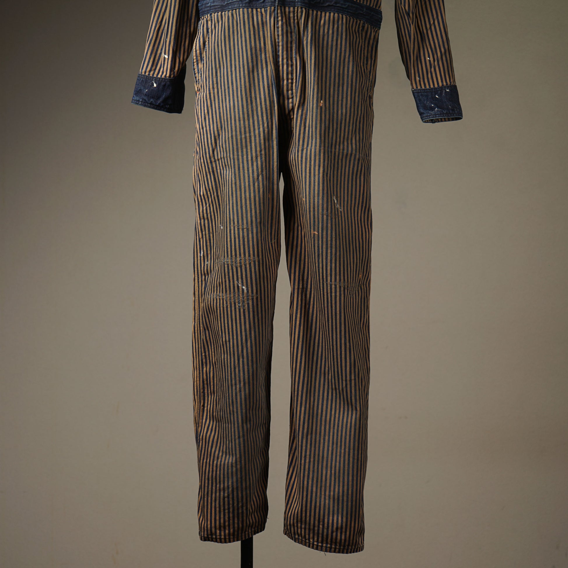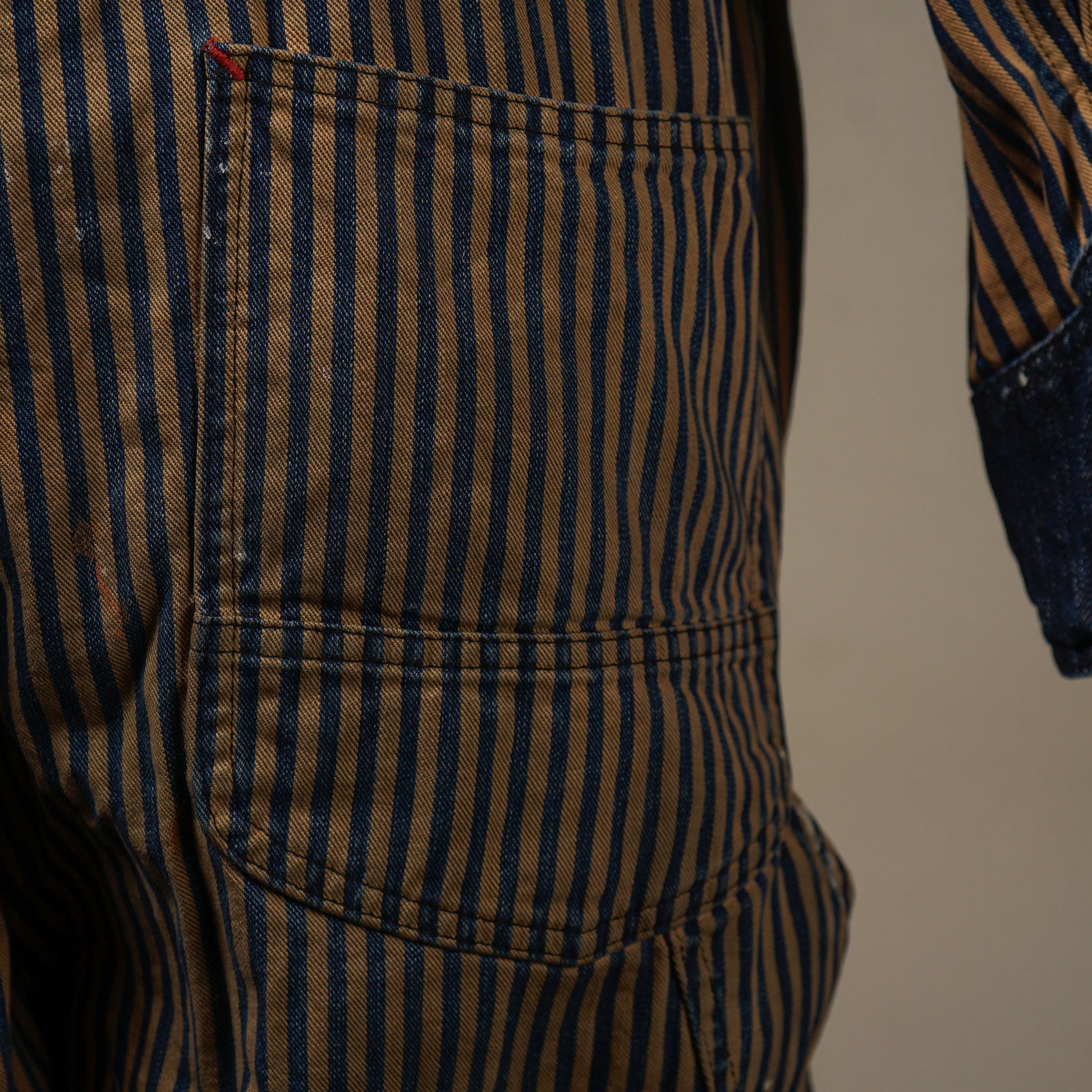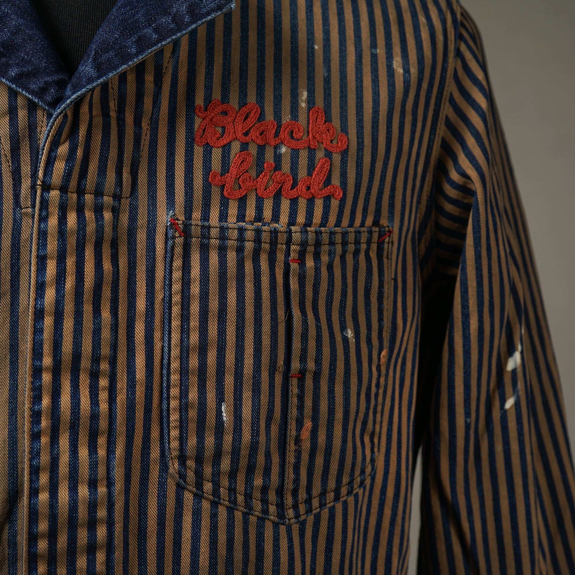 ワークウェアらしくゆとりを持たせたサイズ感で、背面のアクションプリーツや、作業時に釦が邪魔にならないように配慮した比翼仕様、補強布を底面にあてがった大きめのヒップポケットや、ツールポケットなどワークウェアらしいディテールが特徴で、デニムを部分使いした2トーンと、前後のチェーン刺繍や配色のカンヌキがアクセントとなっている。