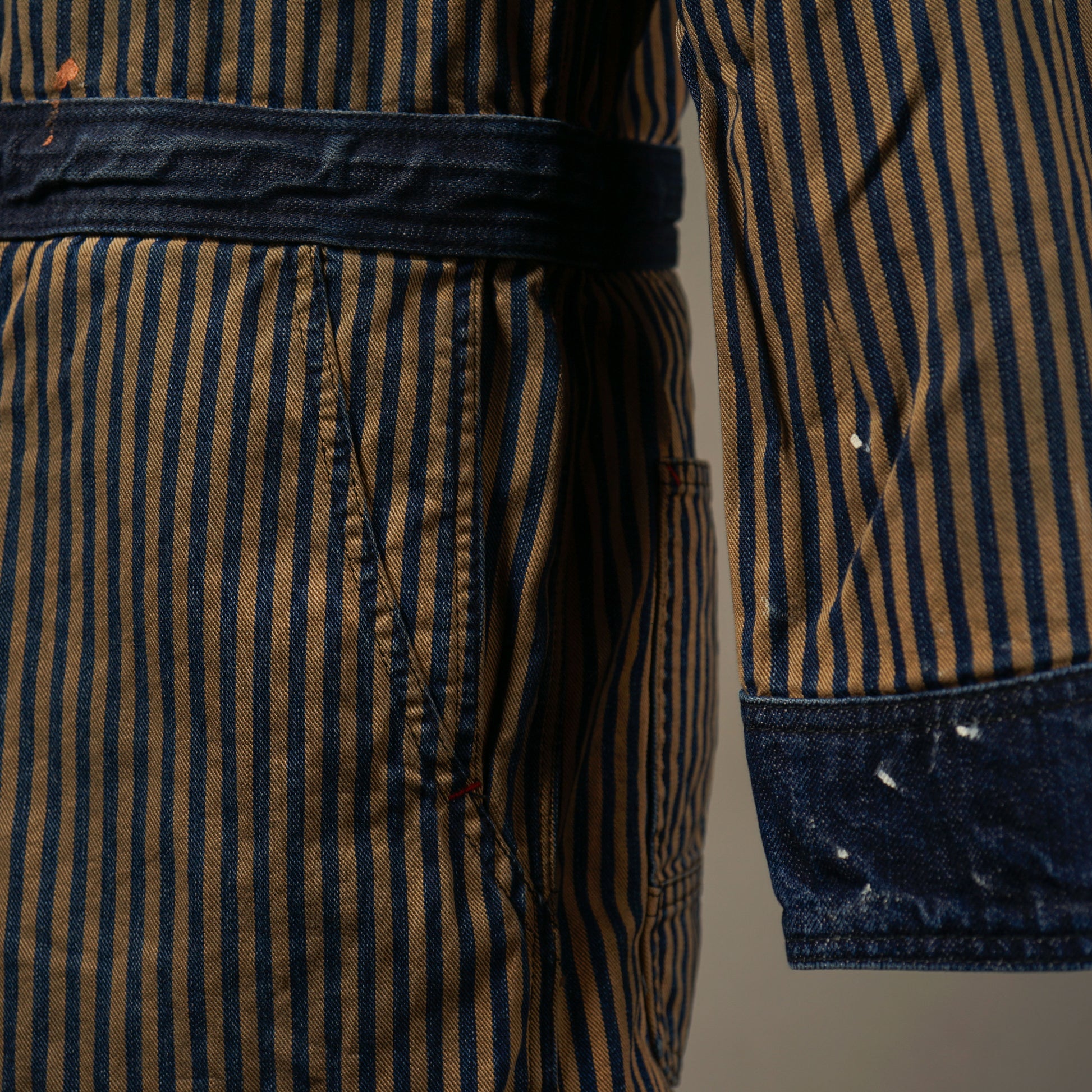 経糸には、短い繊維が多くナチュラルなムラが生み出すヴィンテージ感が特徴の糸を、ロープインディゴ染めと硫化染めで先染めして使用。緯糸には上質な米綿をベースにブレンドした、ナチュラルなムラ形状の糸を硫化染めで先染めして使用したオリジナルのヒッコリー生地。