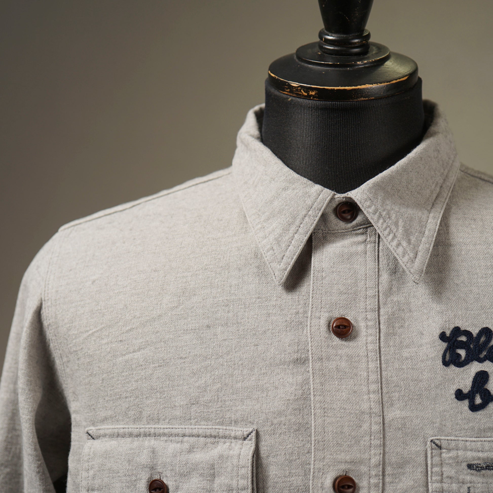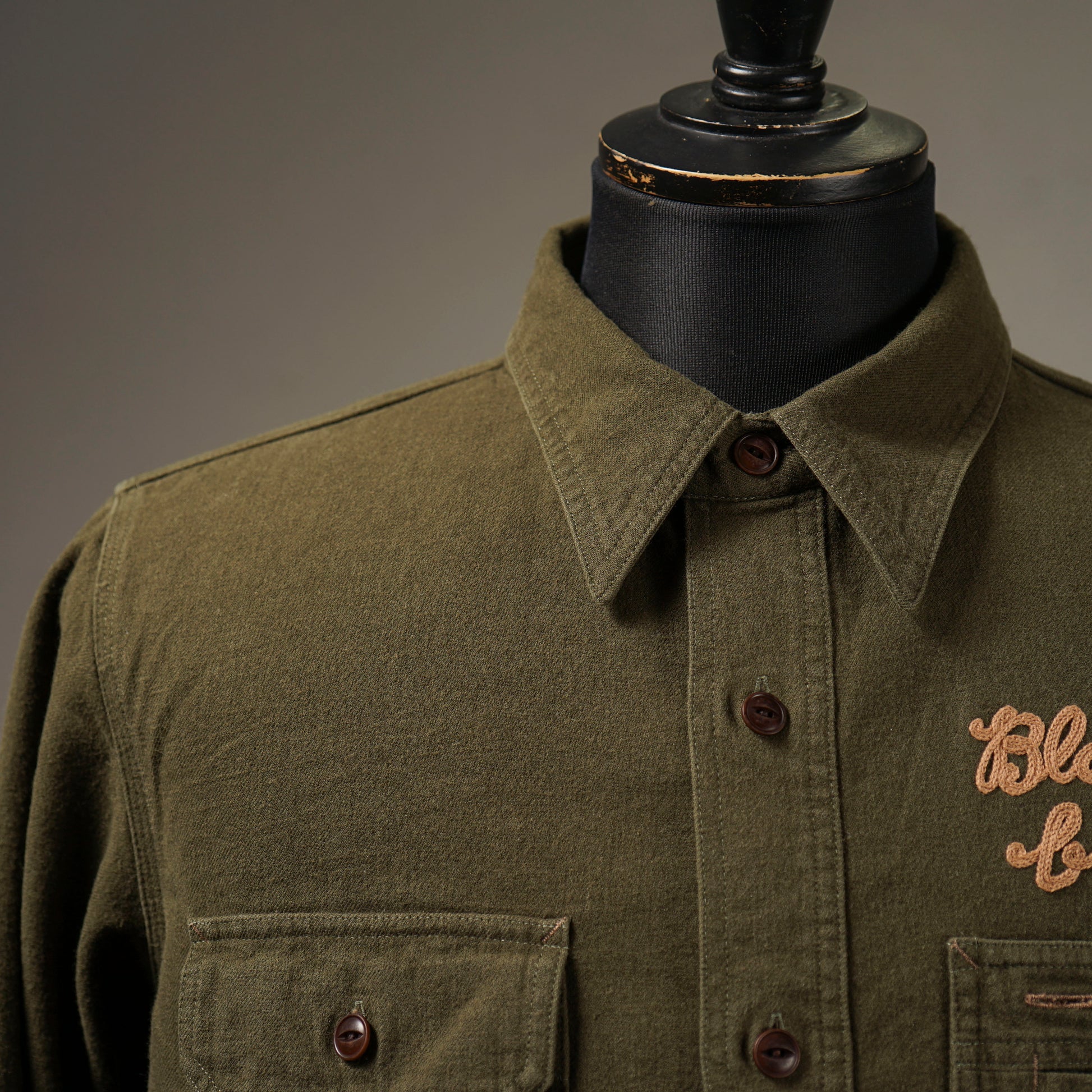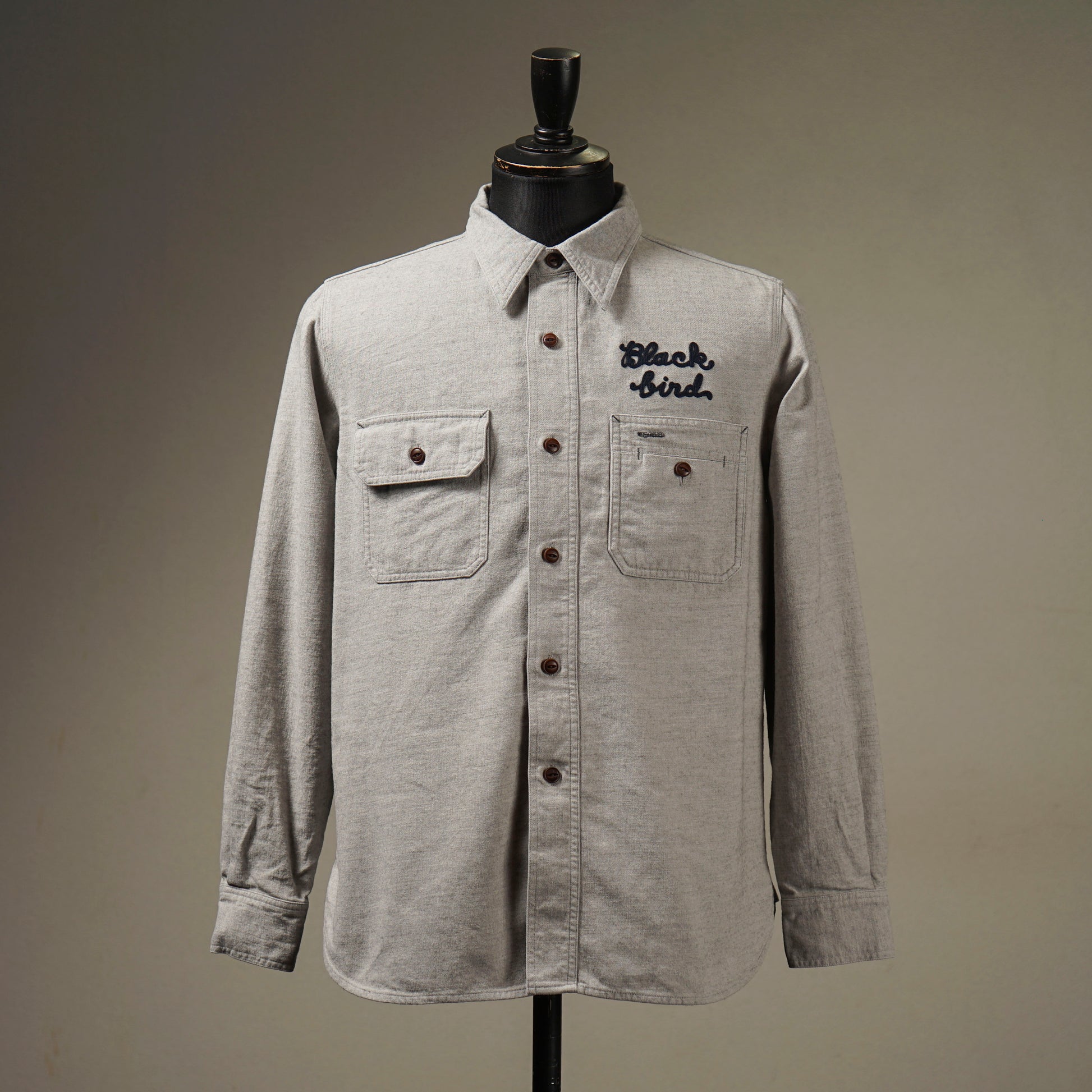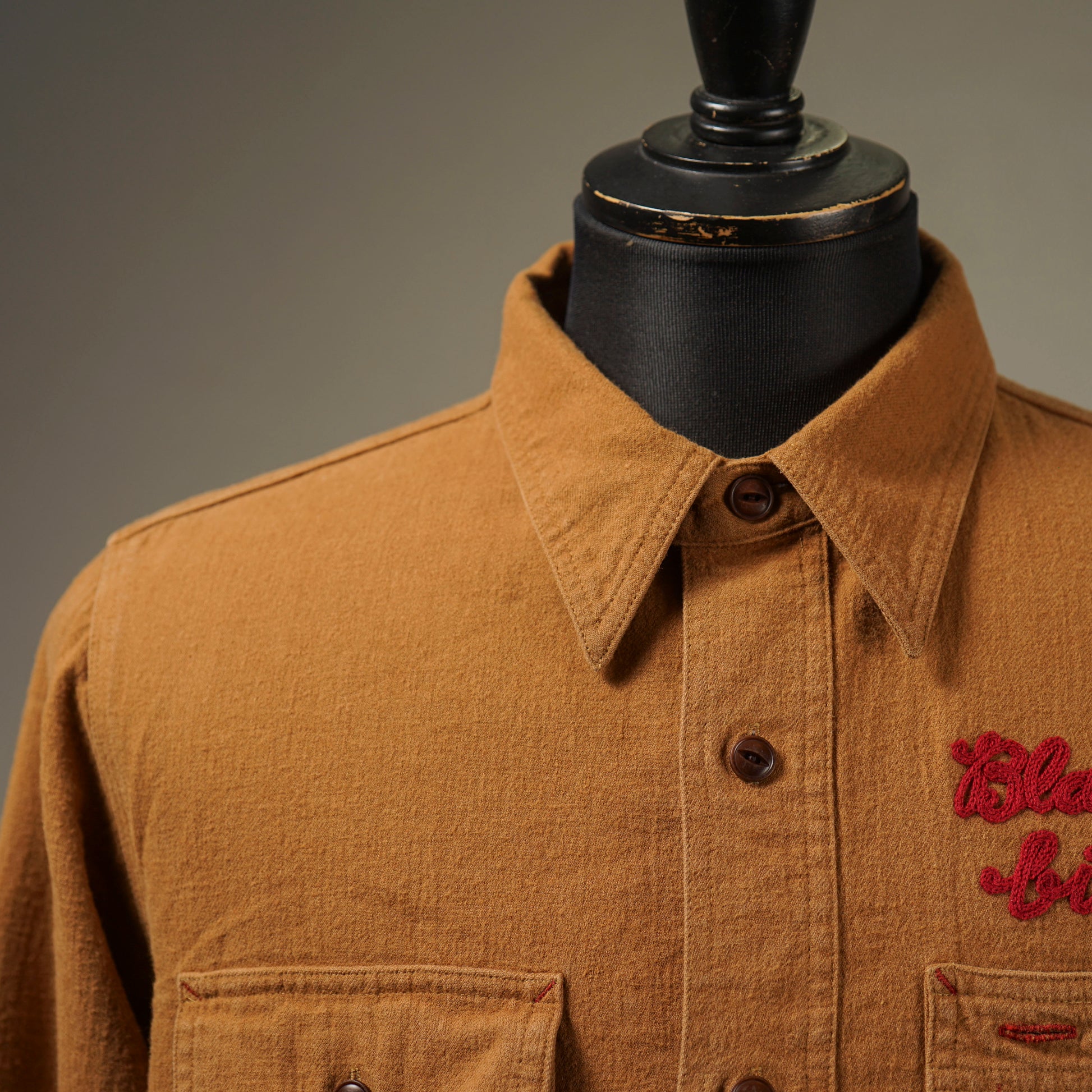 1940年代のWORK SHIRTをベースにしたチンストラップ付きで、左右非対称なガチャポケ仕様にデザイン。ワークシャツらしい、やや余裕を持たせたレギュラーフィットシルエット。前後のチェーン刺繍や、配色のカンヌキ、前立て裏や袖口部分の別布使いがアクセントとなっています。
