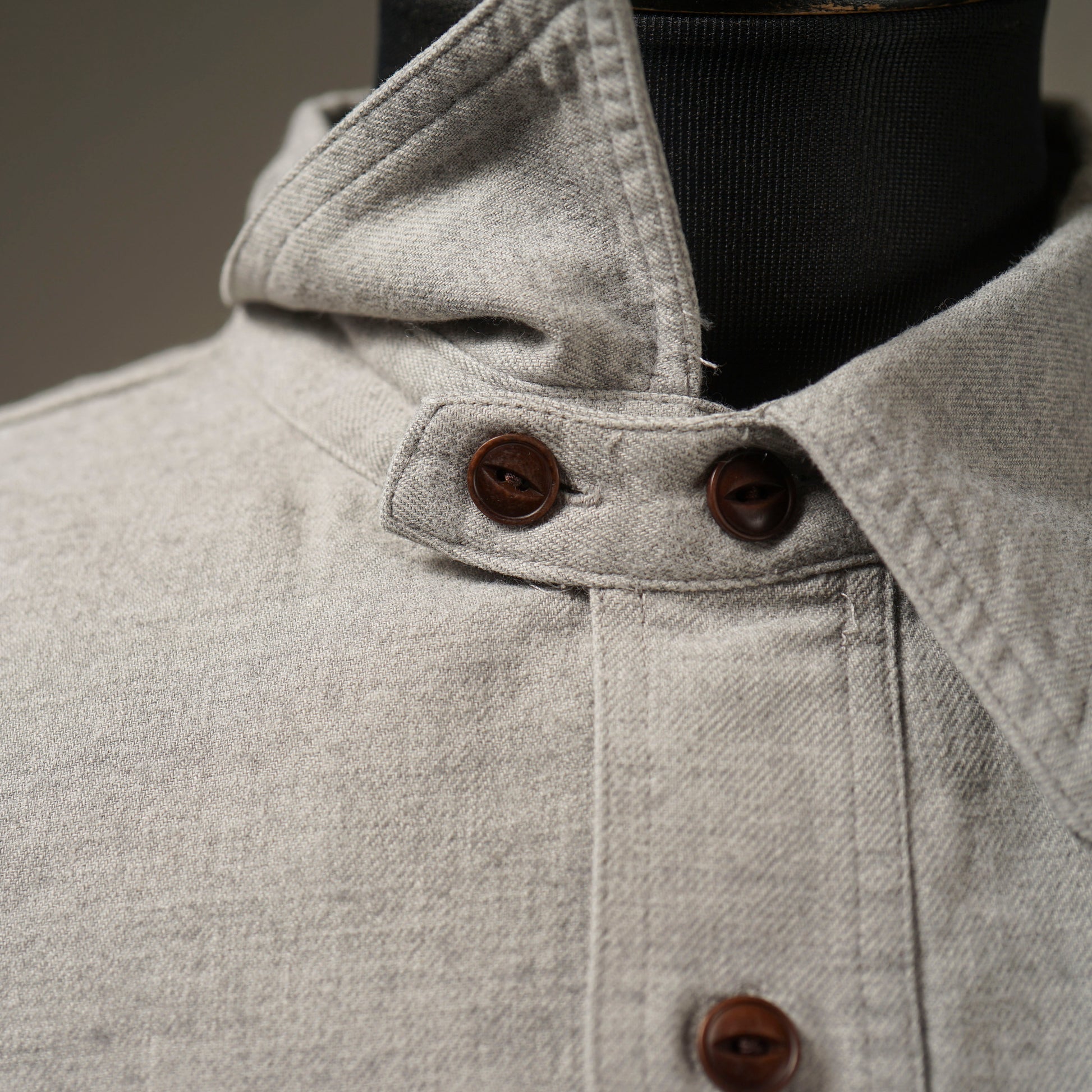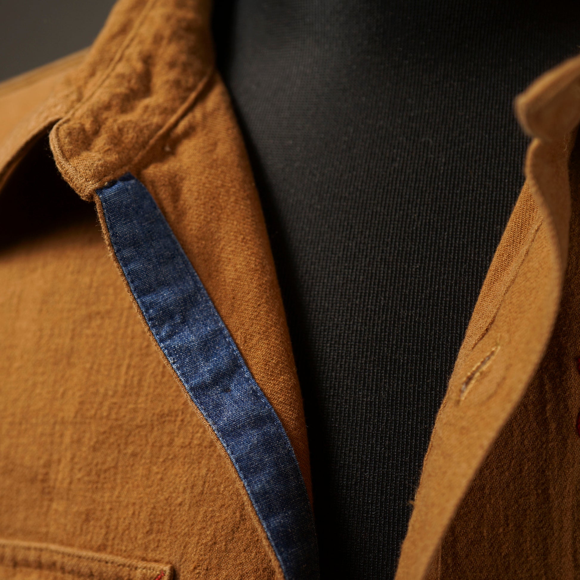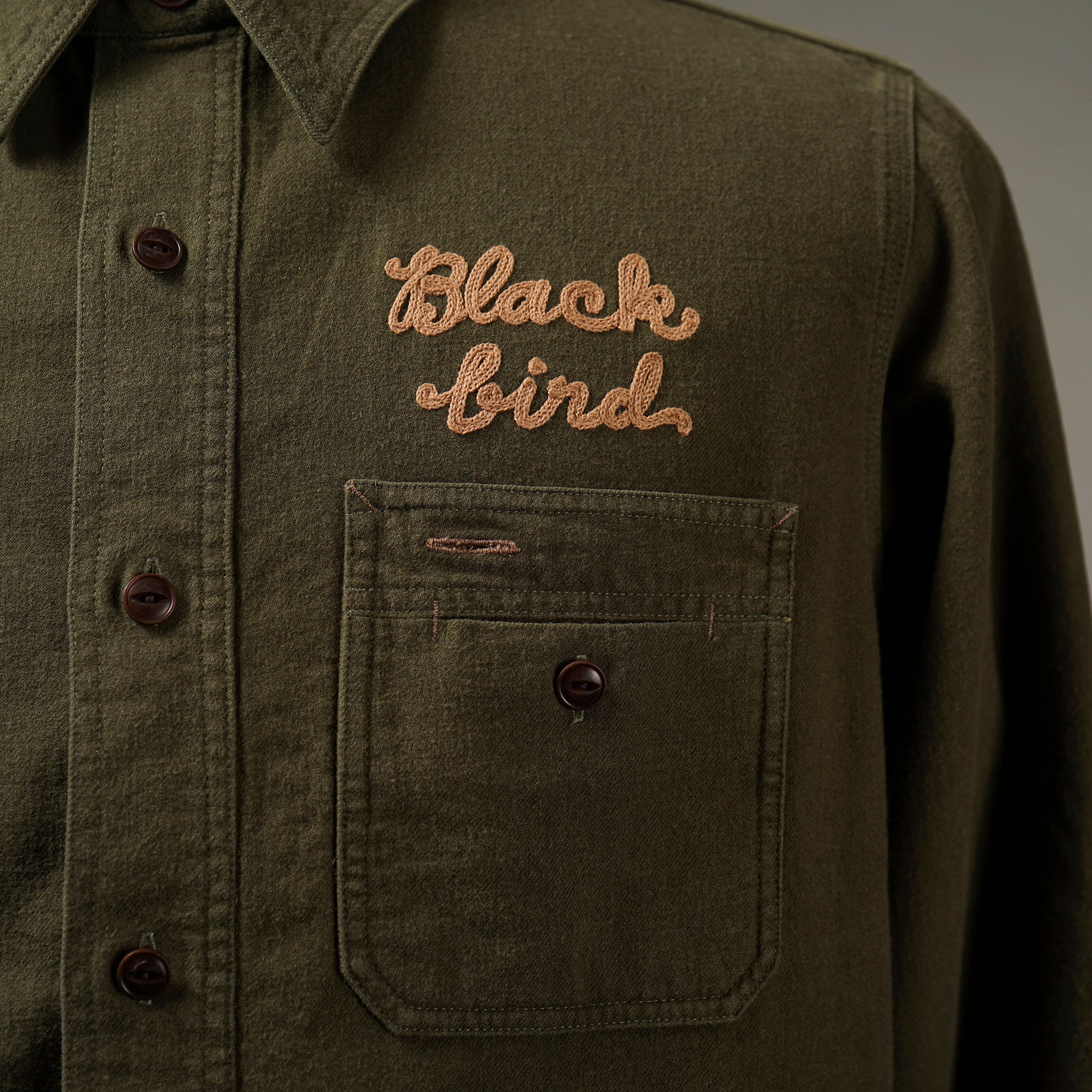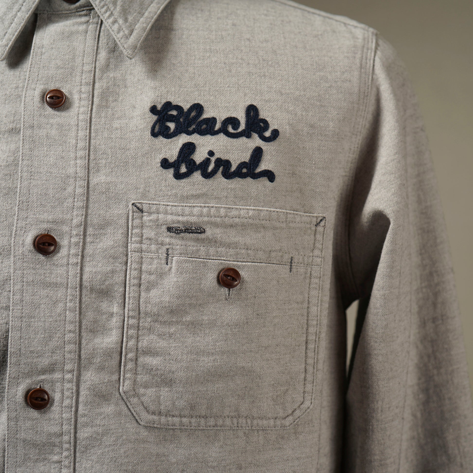 1940年代のWORK SHIRTをベースにしたチンストラップ付きで、左右非対称なガチャポケ仕様にデザイン。ワークシャツらしい、やや余裕を持たせたレギュラーフィットシルエット。前後のチェーン刺繍や、配色のカンヌキ、前立て裏や袖口部分の別布使いがアクセントとなっています。