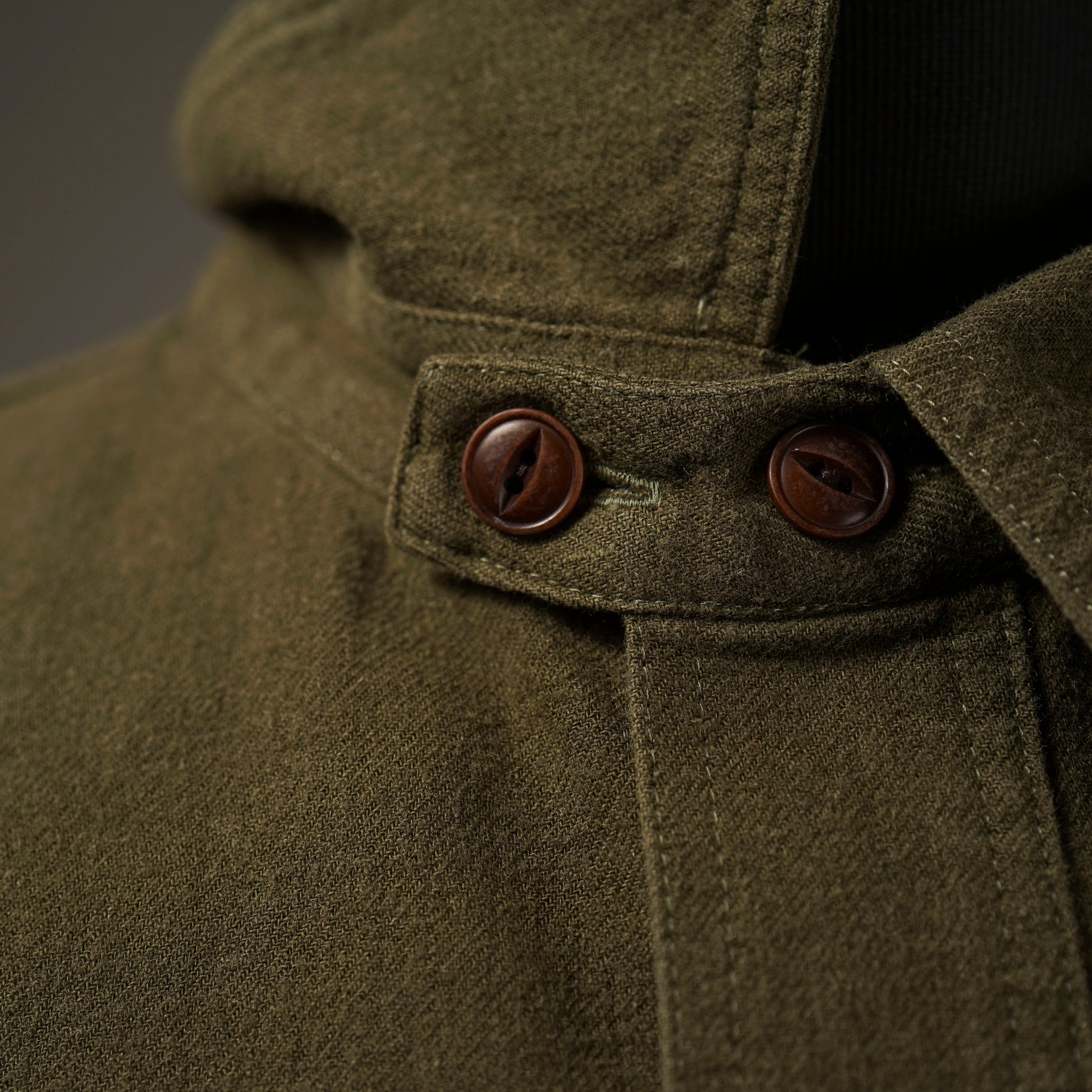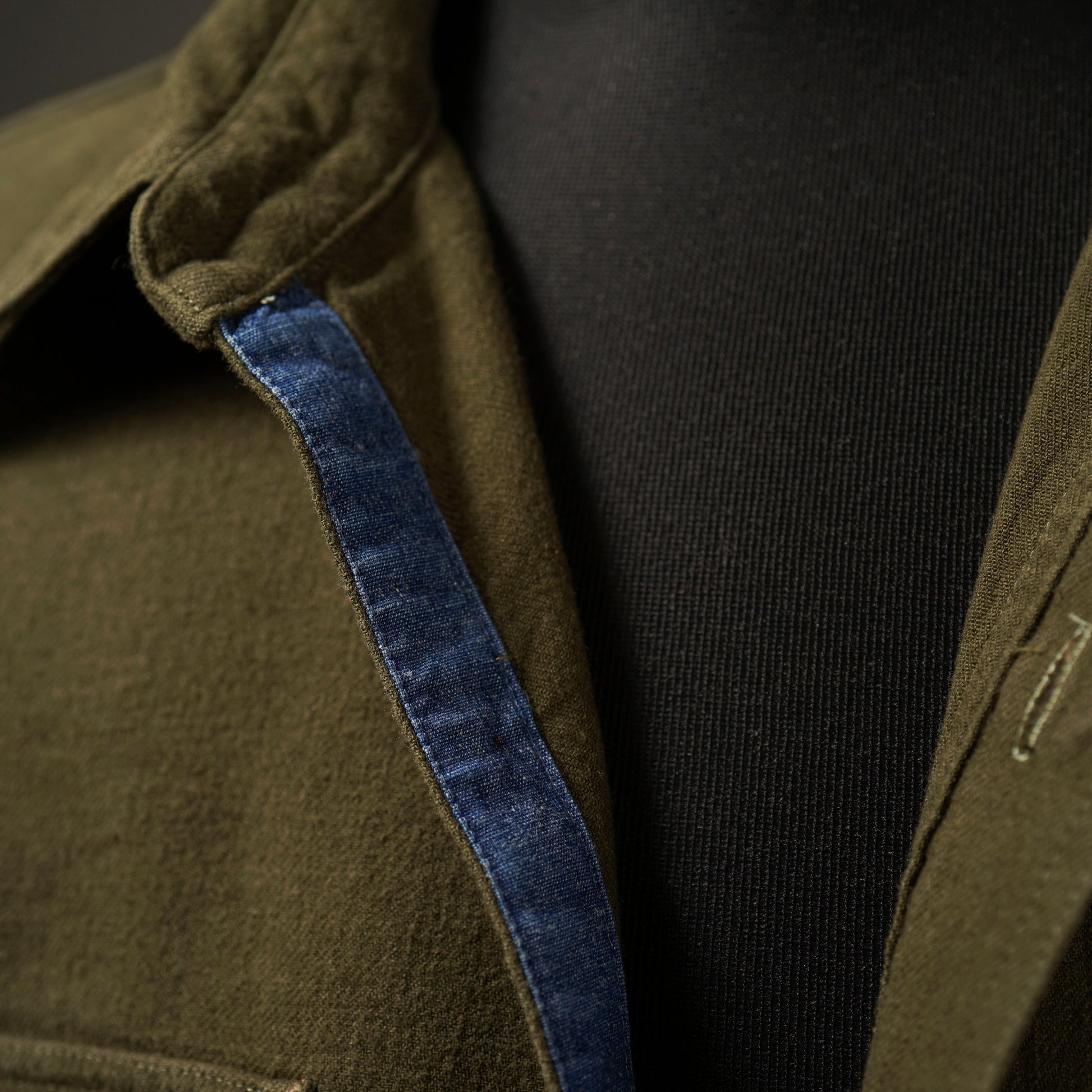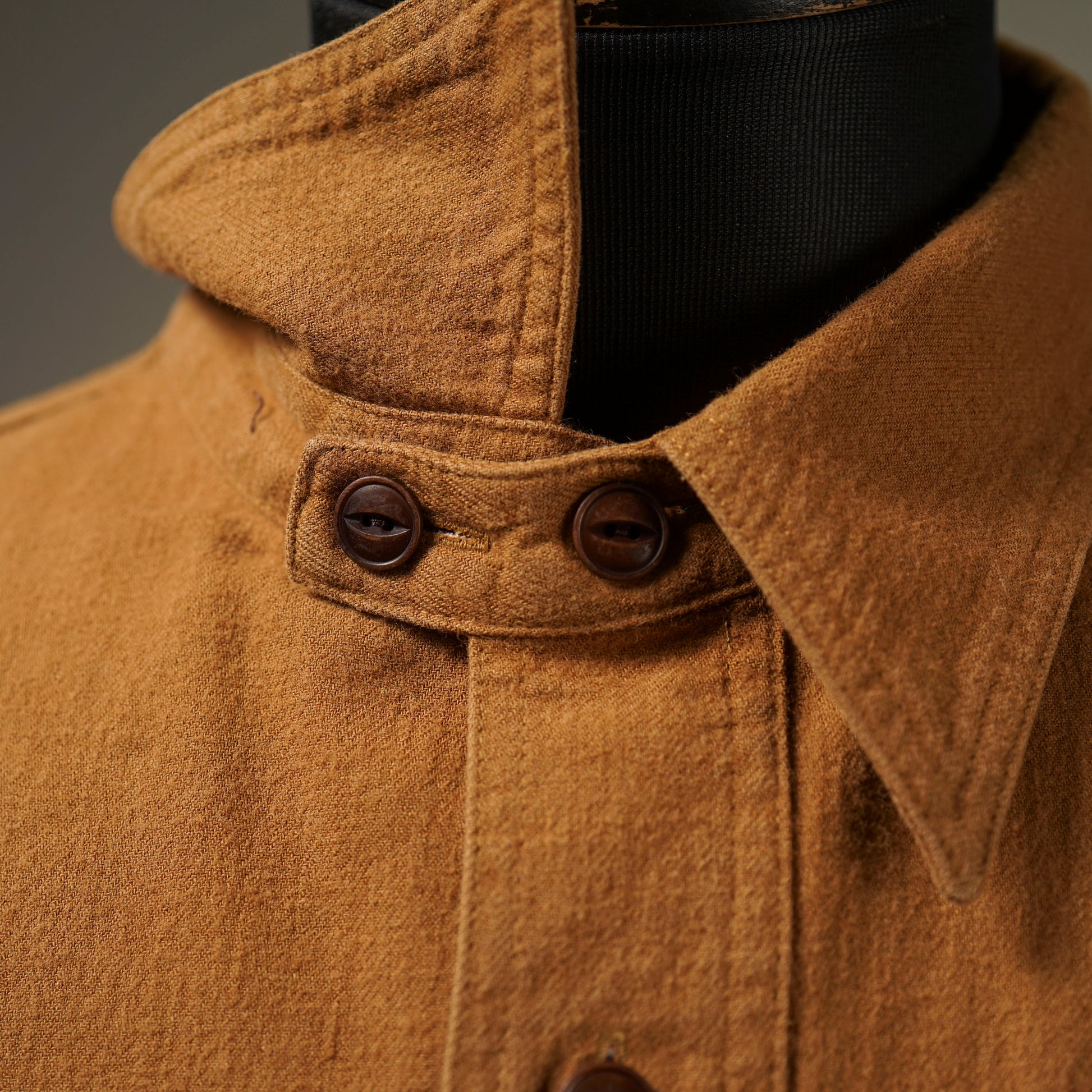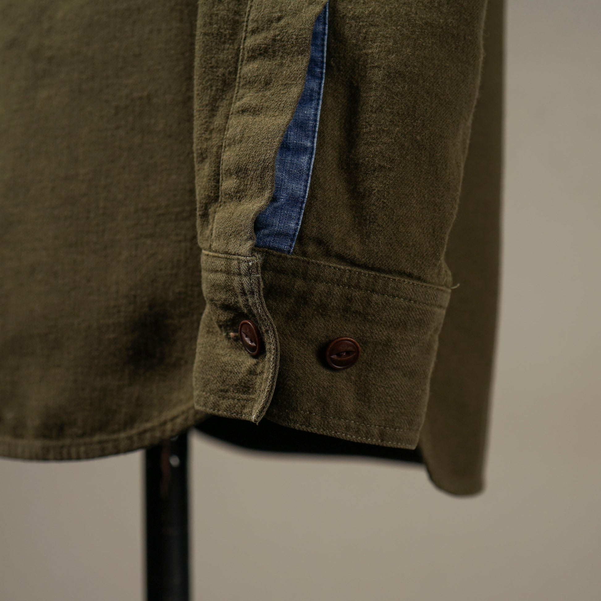 1940年代のWORK SHIRTをベースにしたチンストラップ付きで、左右非対称なガチャポケ仕様にデザイン。ワークシャツらしい、やや余裕を持たせたレギュラーフィットシルエット。前後のチェーン刺繍や、配色のカンヌキ、前立て裏や袖口部分の別布使いがアクセントとなっています。