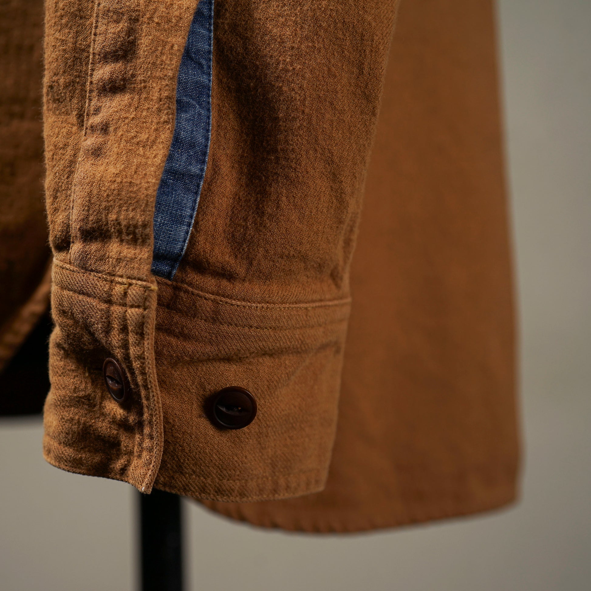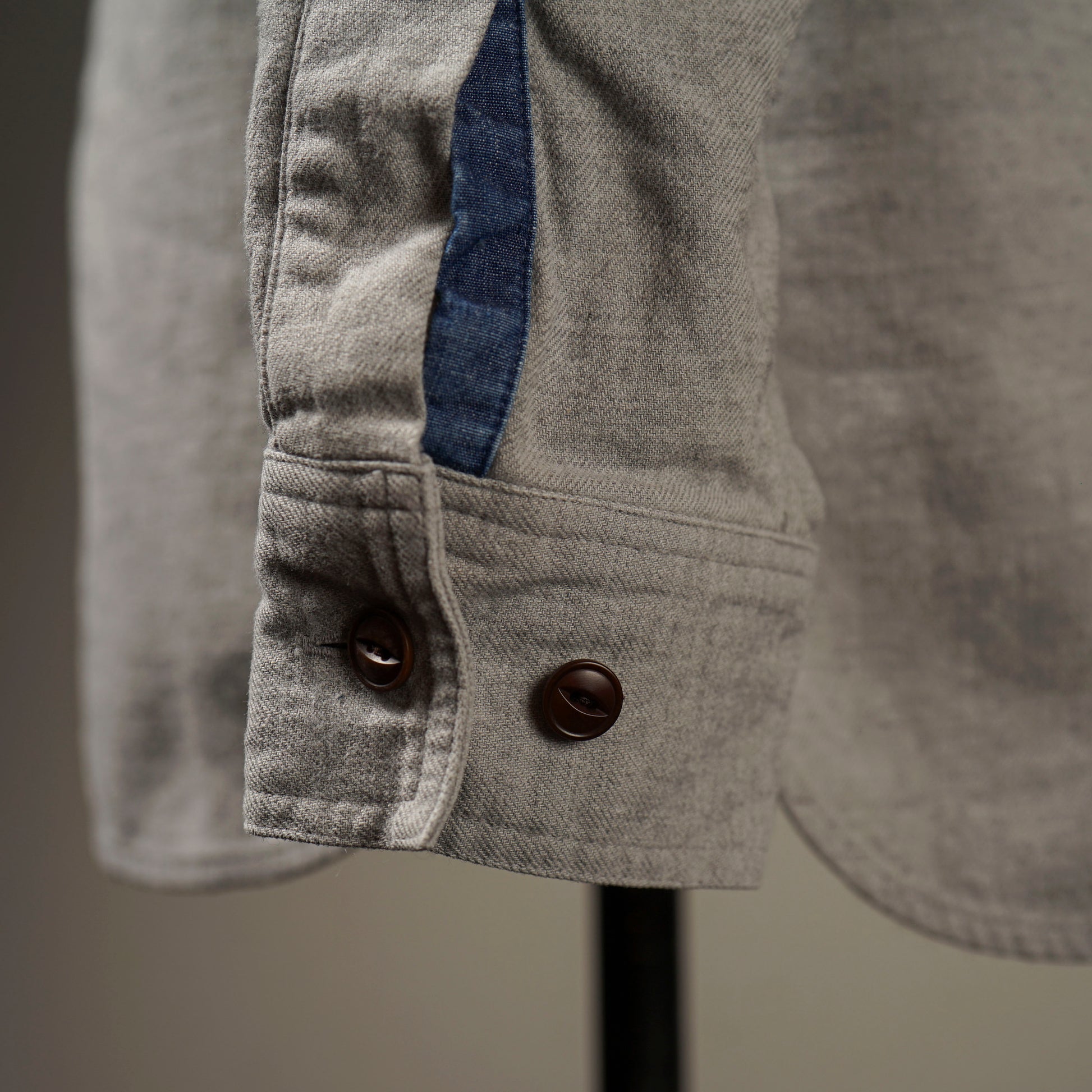 経糸に麻独自の張り感と綿の柔らが程度よく混ざりあった綿麻混紡糸を使用し、緯糸には綿ウール混紡糸を使用する事で、ウール独自のドライタッチな手触り感も加わった、独特な風合いの仕上がりになっています。