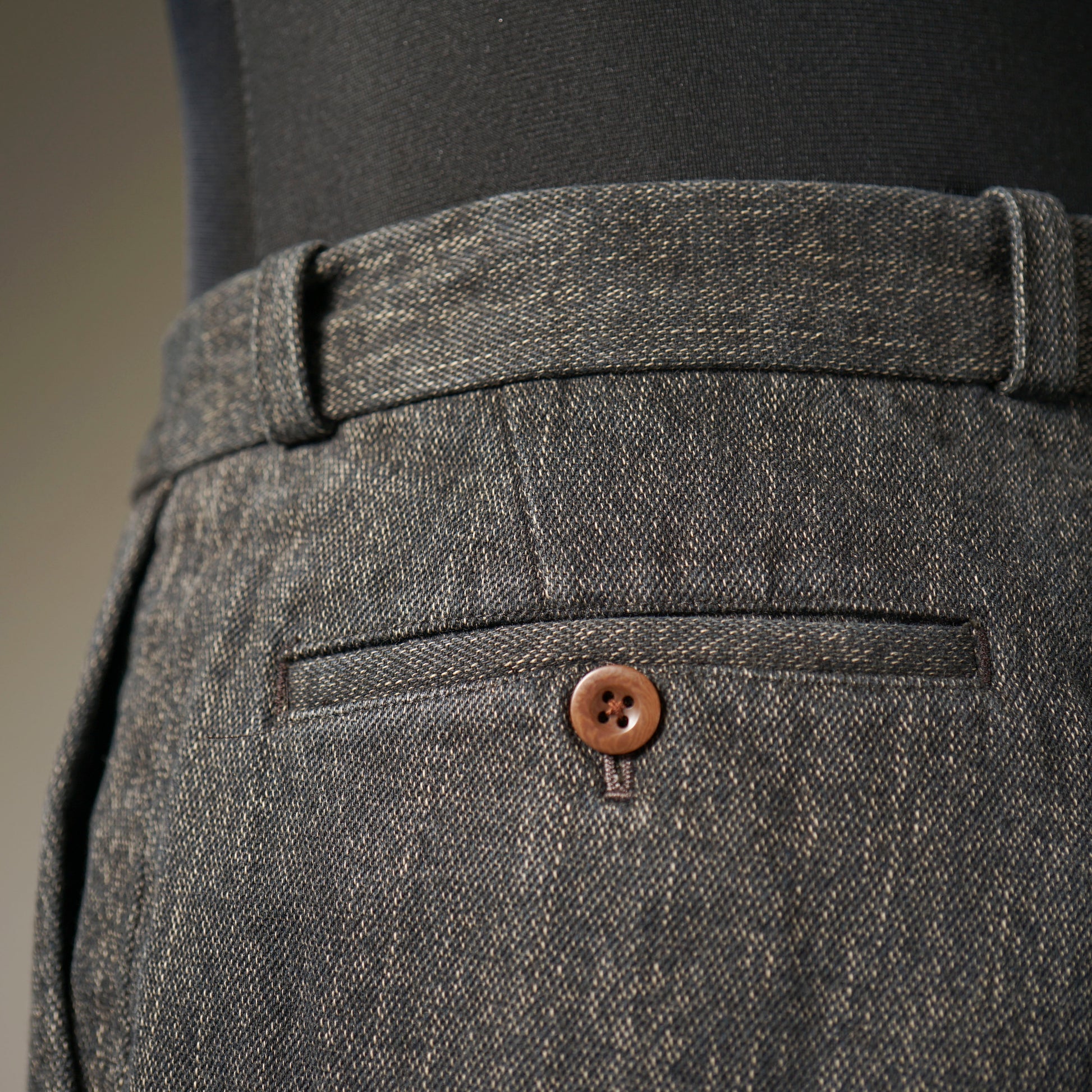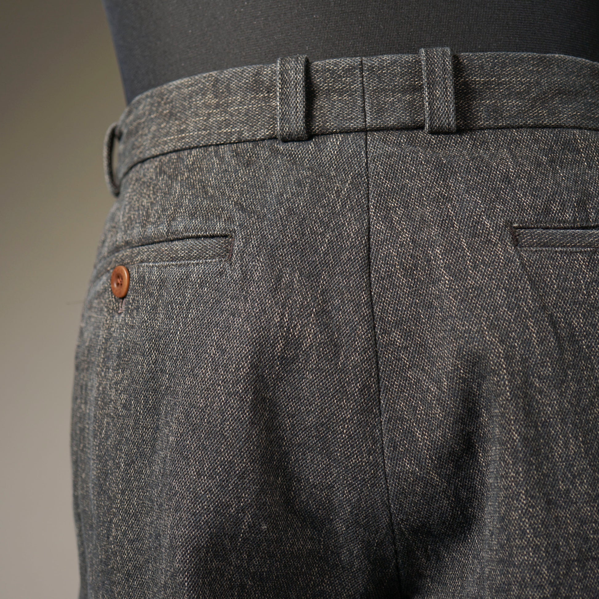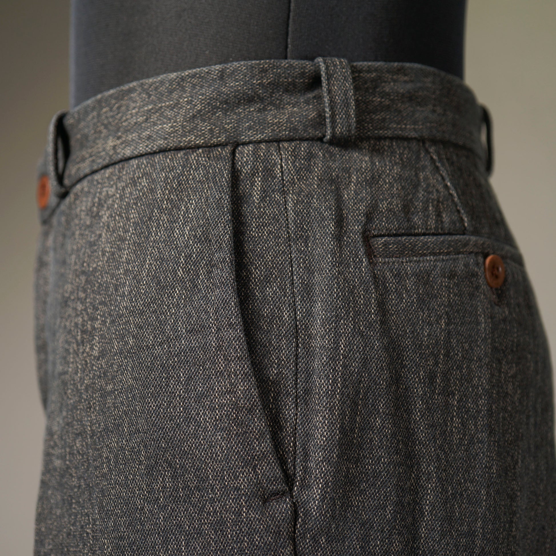 ワタリ部分にややゆとりをもたせ、裾にかけてテーパードのかかったシルエット。