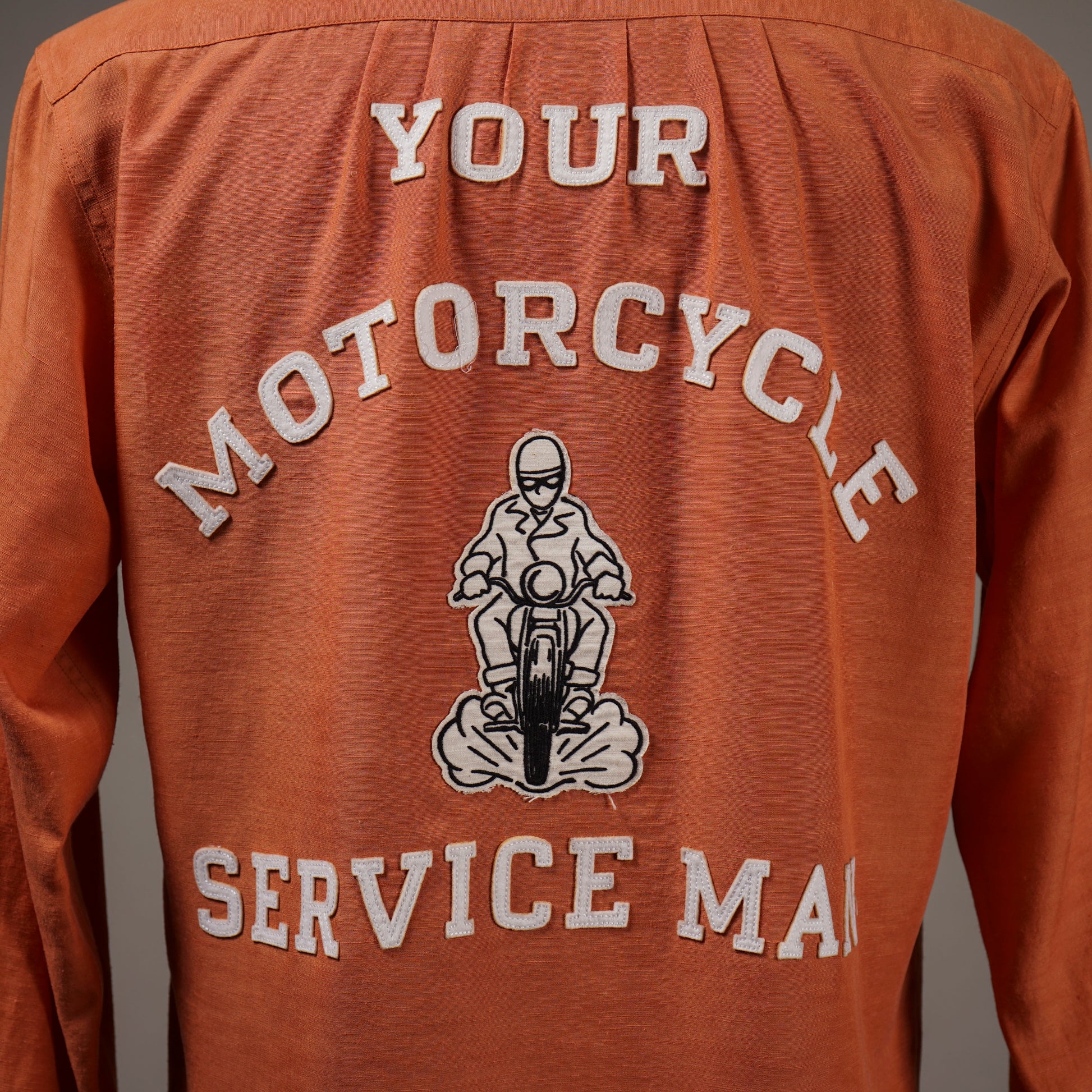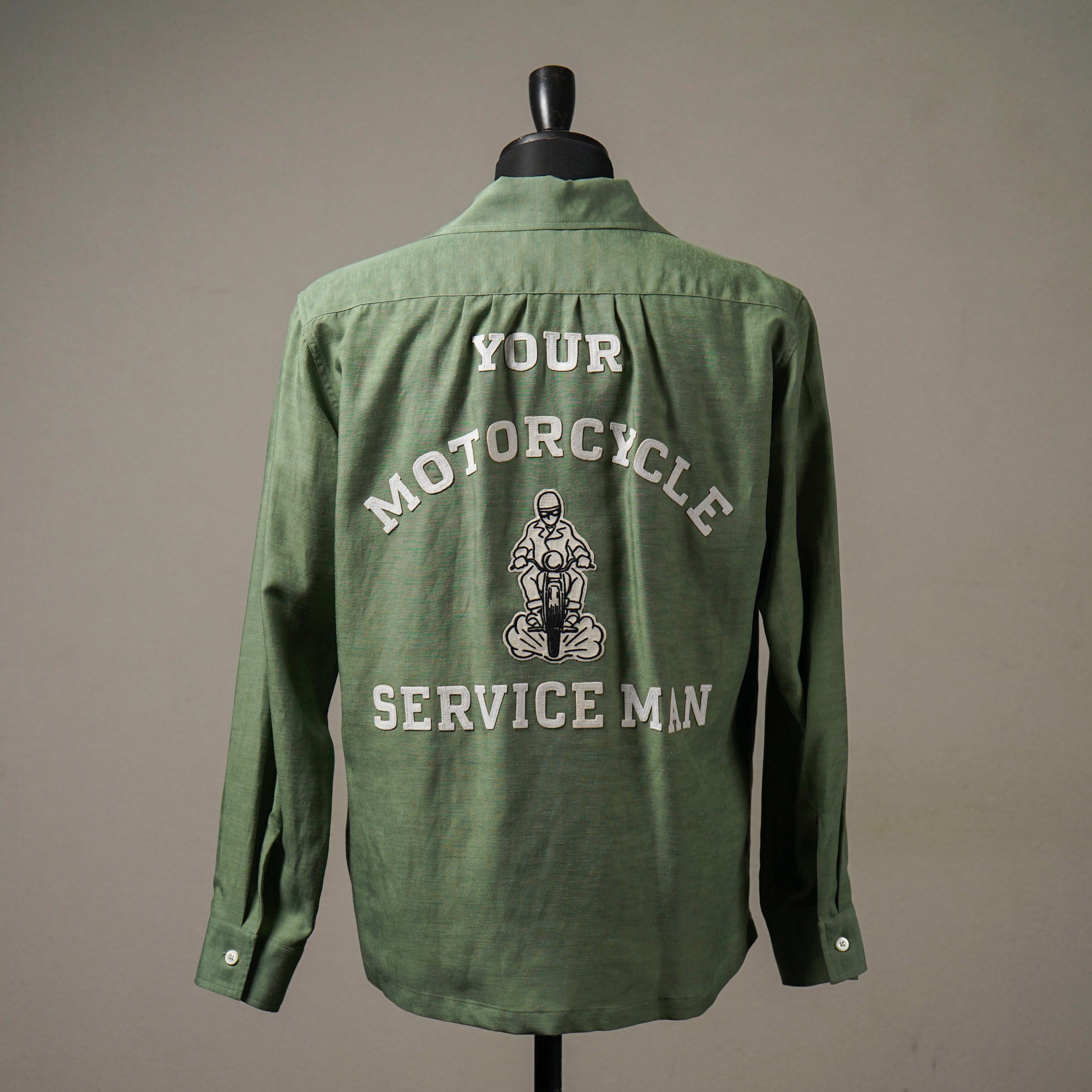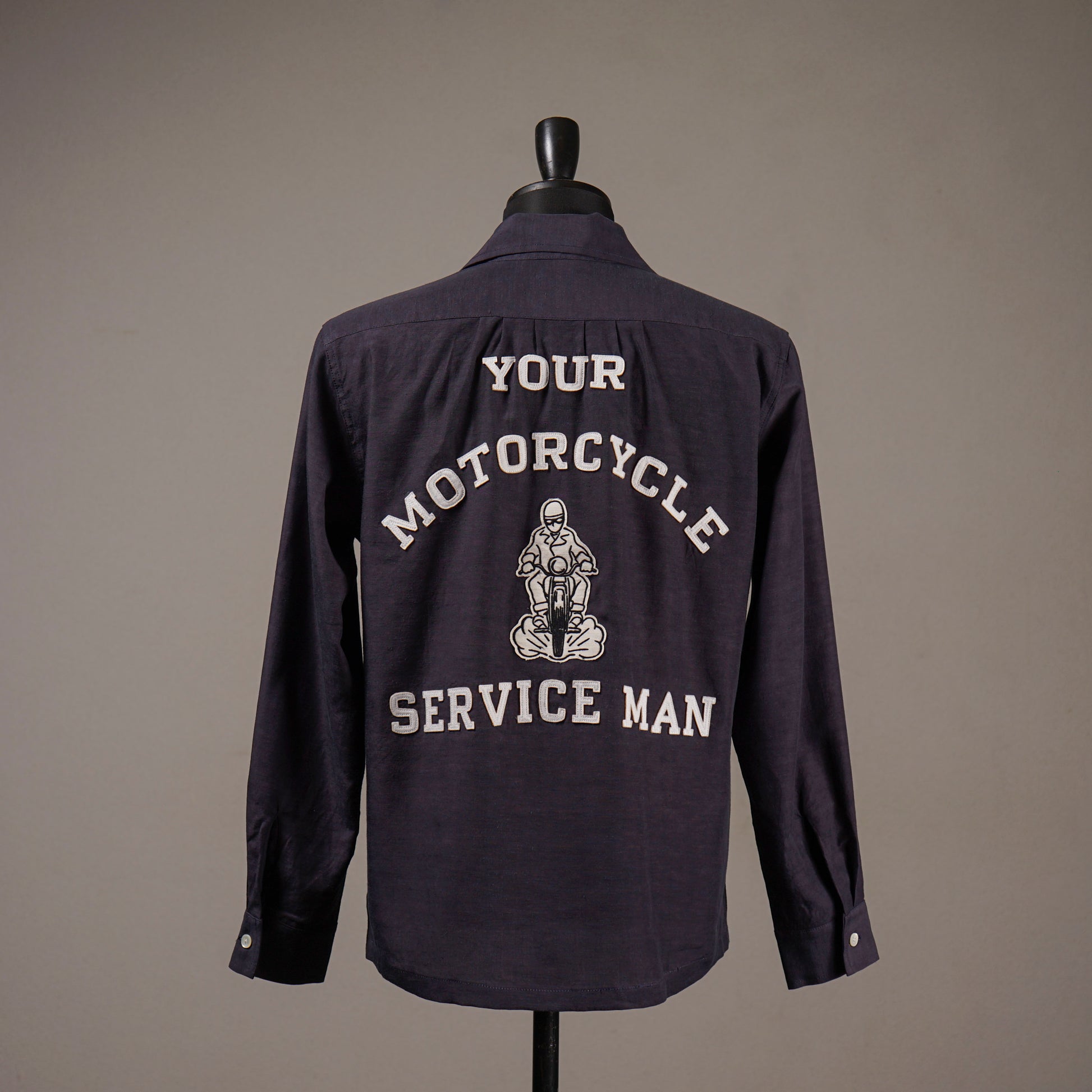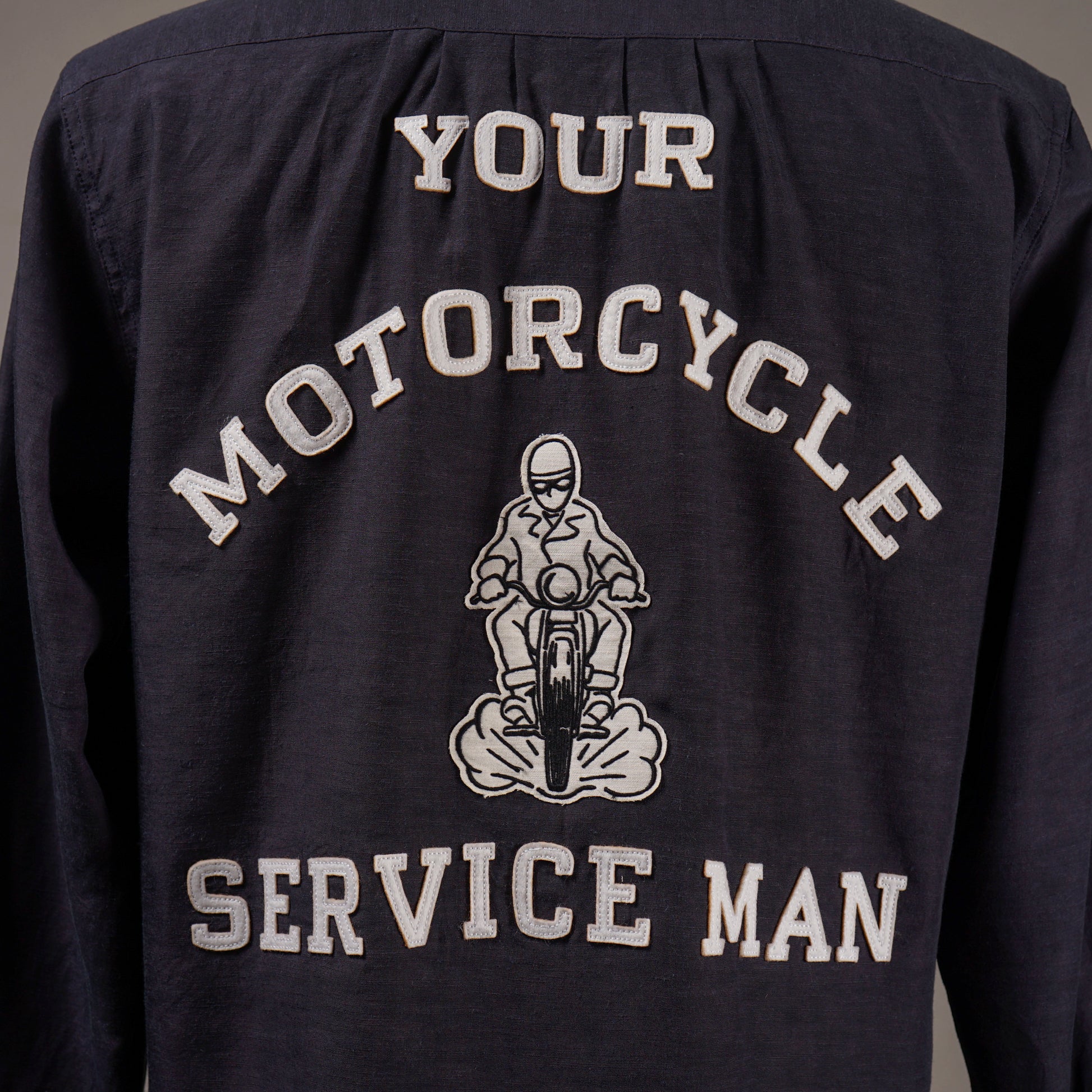 MC SERVICEMAN:古き良きバイクショップの看板やユニフォームから切り取った、親しみと信頼を象徴するクラシックなフレーズ。