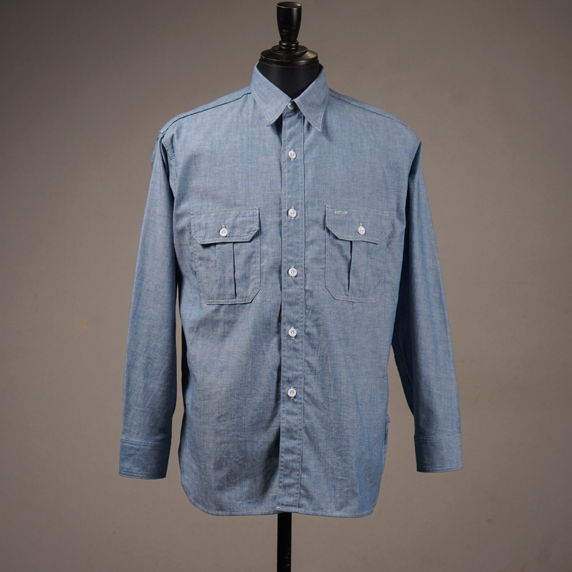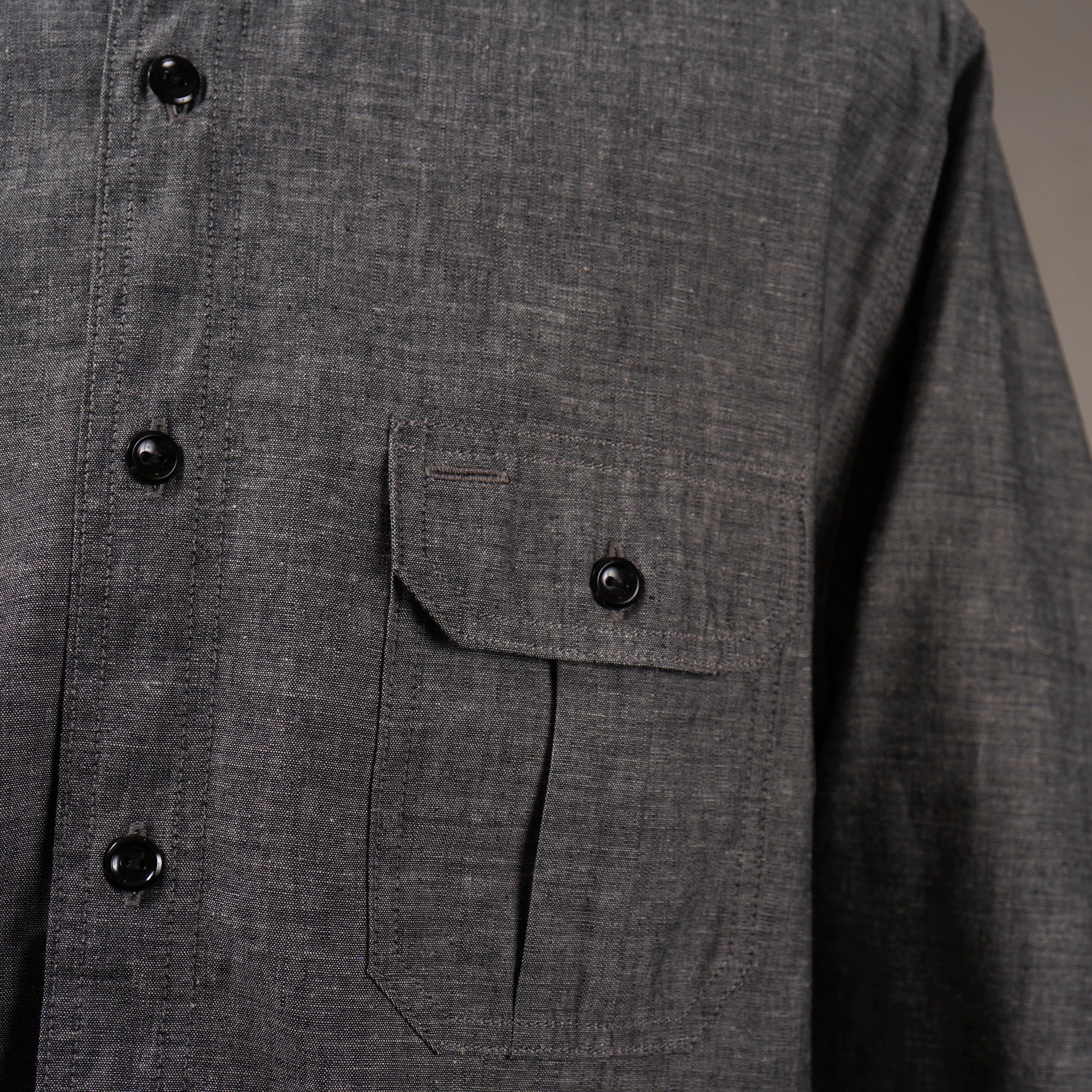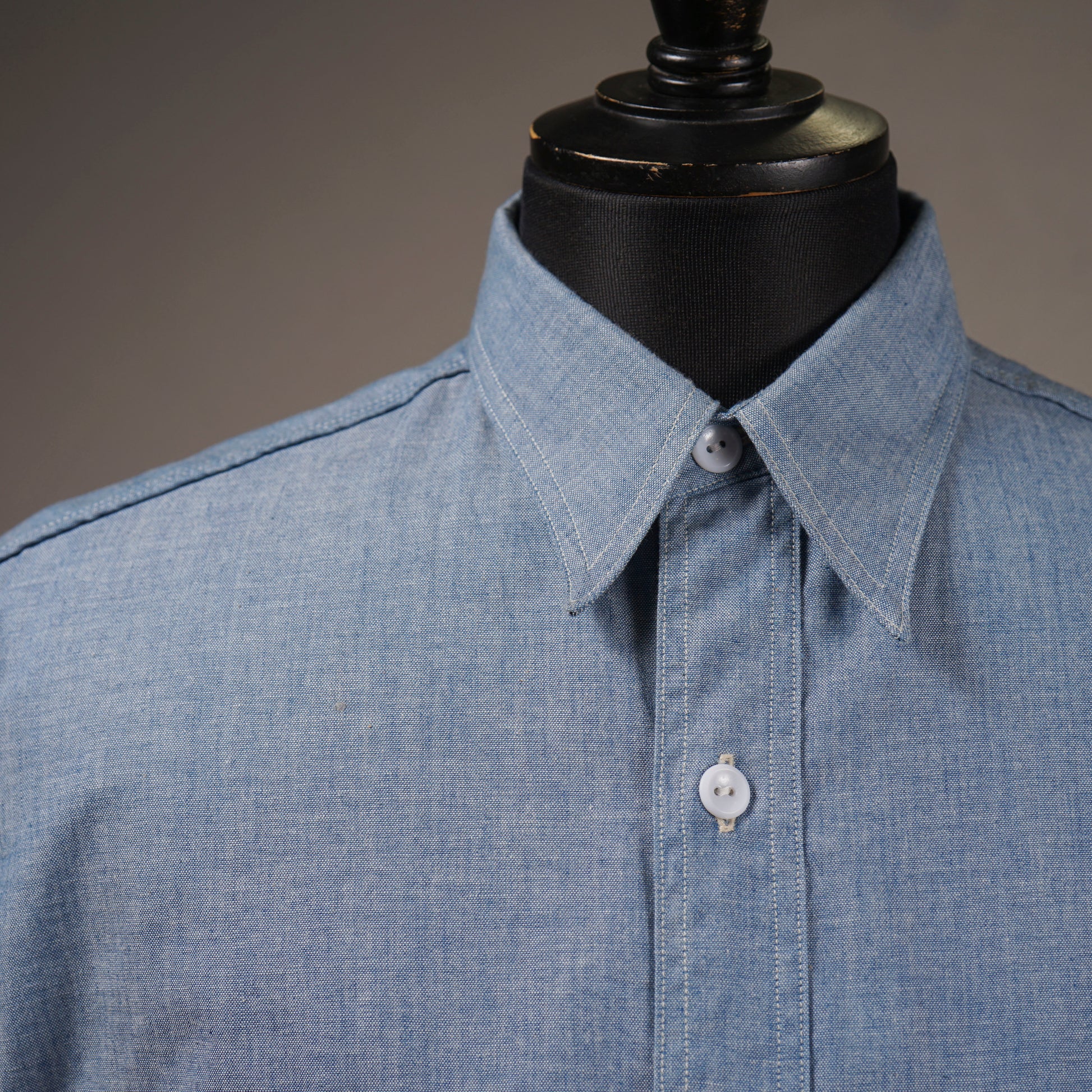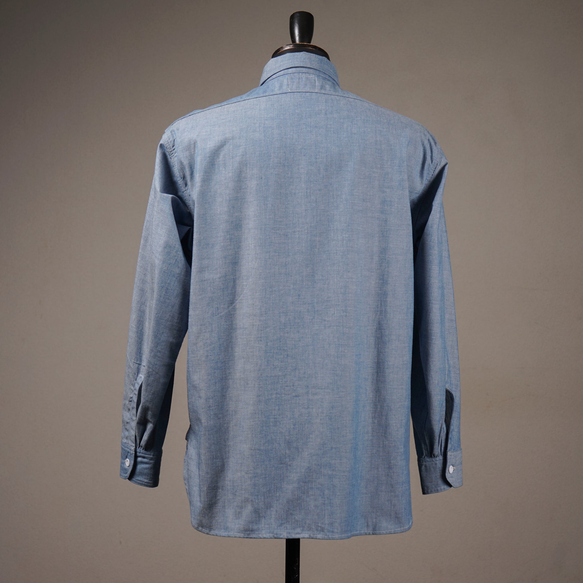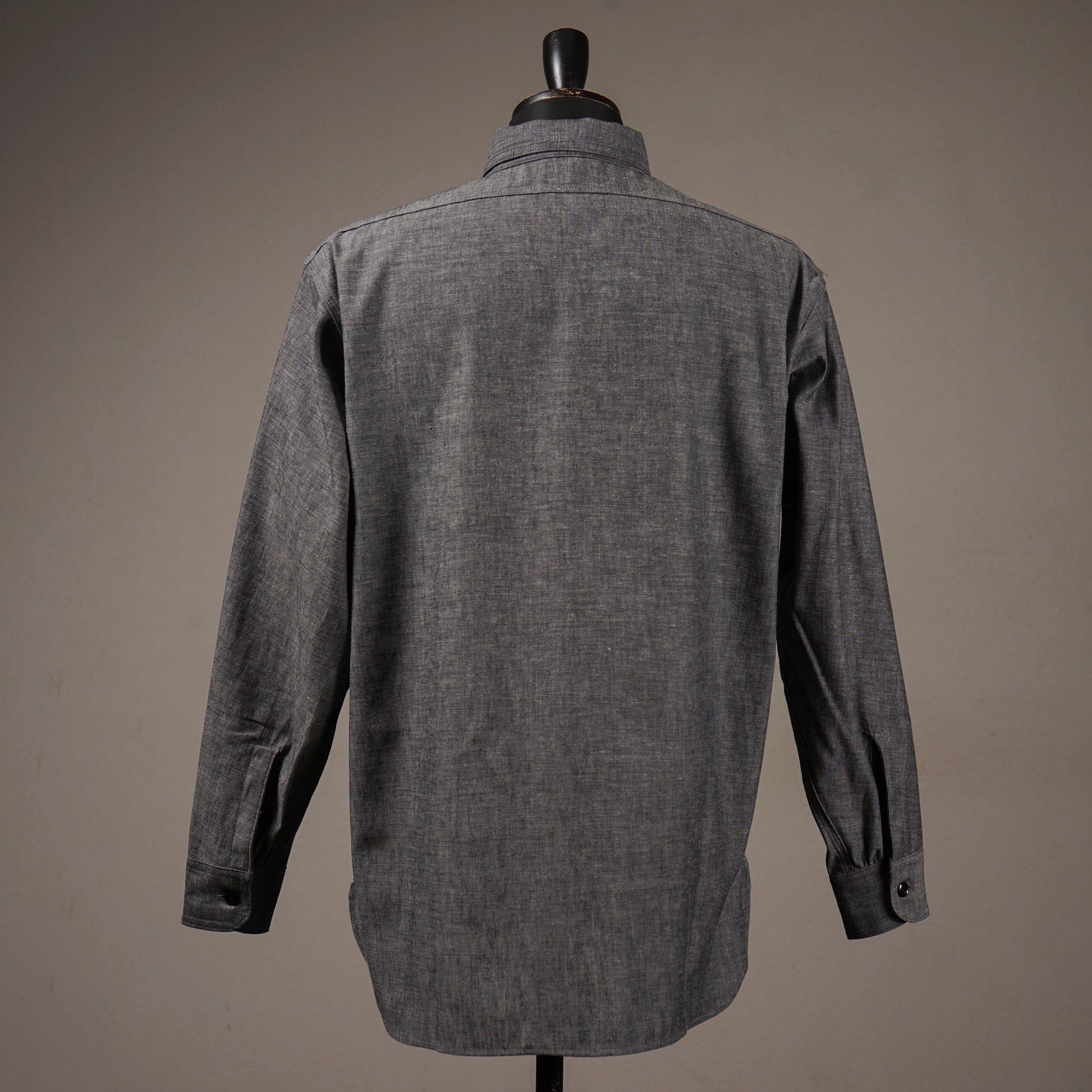 1950年代のWORK SHIRTを参考にした、やや余裕を持たせたレギュラーフィットのシャンブレーワークシャツ。縫製は全て綿糸を使用、生地から縫製、加工まですべて岡山で行いました。3本針巻き縫い縫製、裾脇のガゼットなどワークシャツならではの仕様になっています。