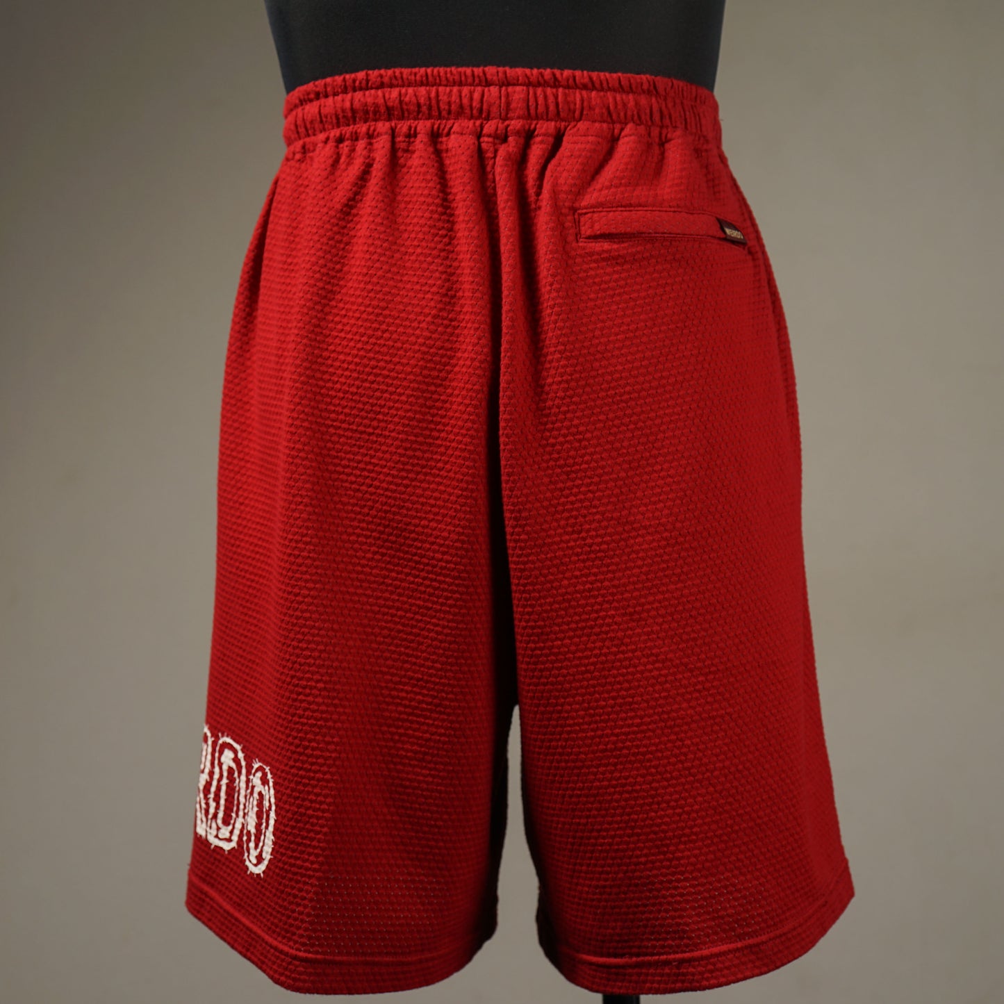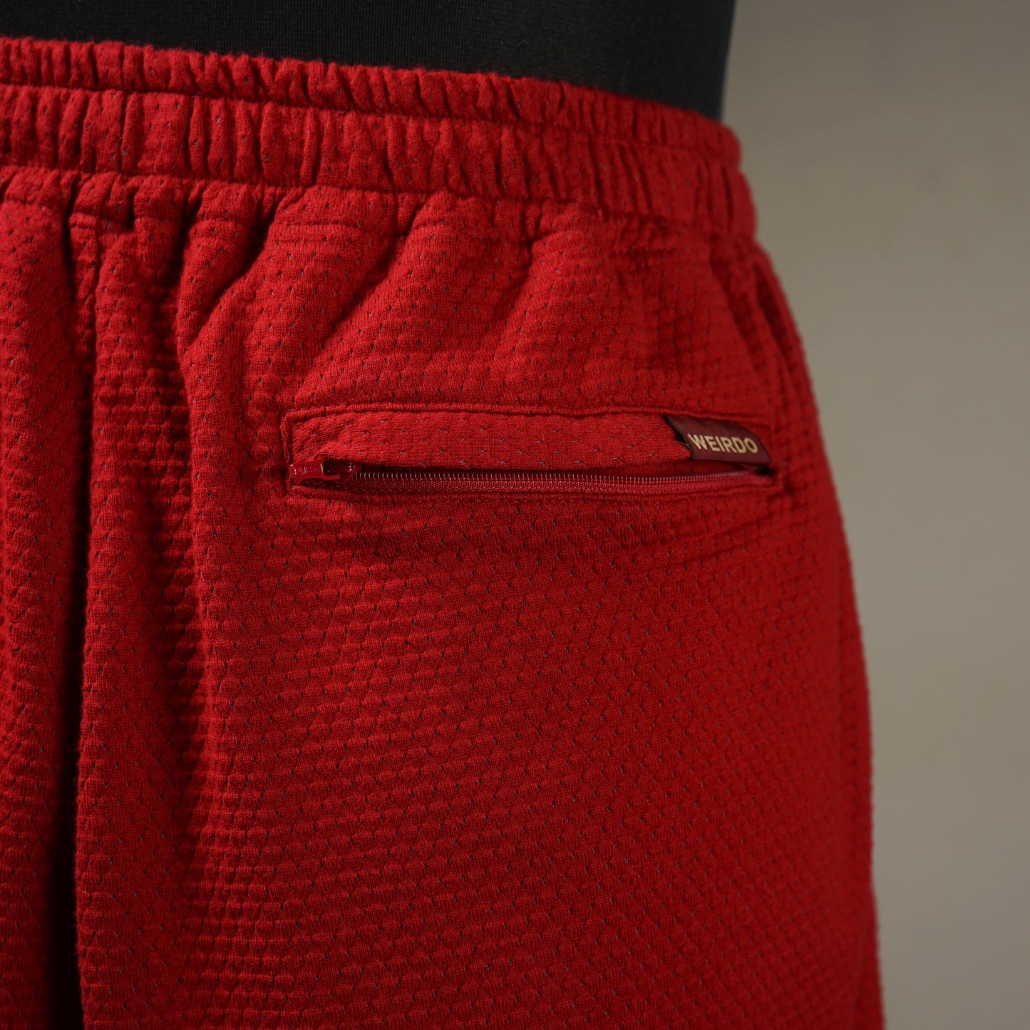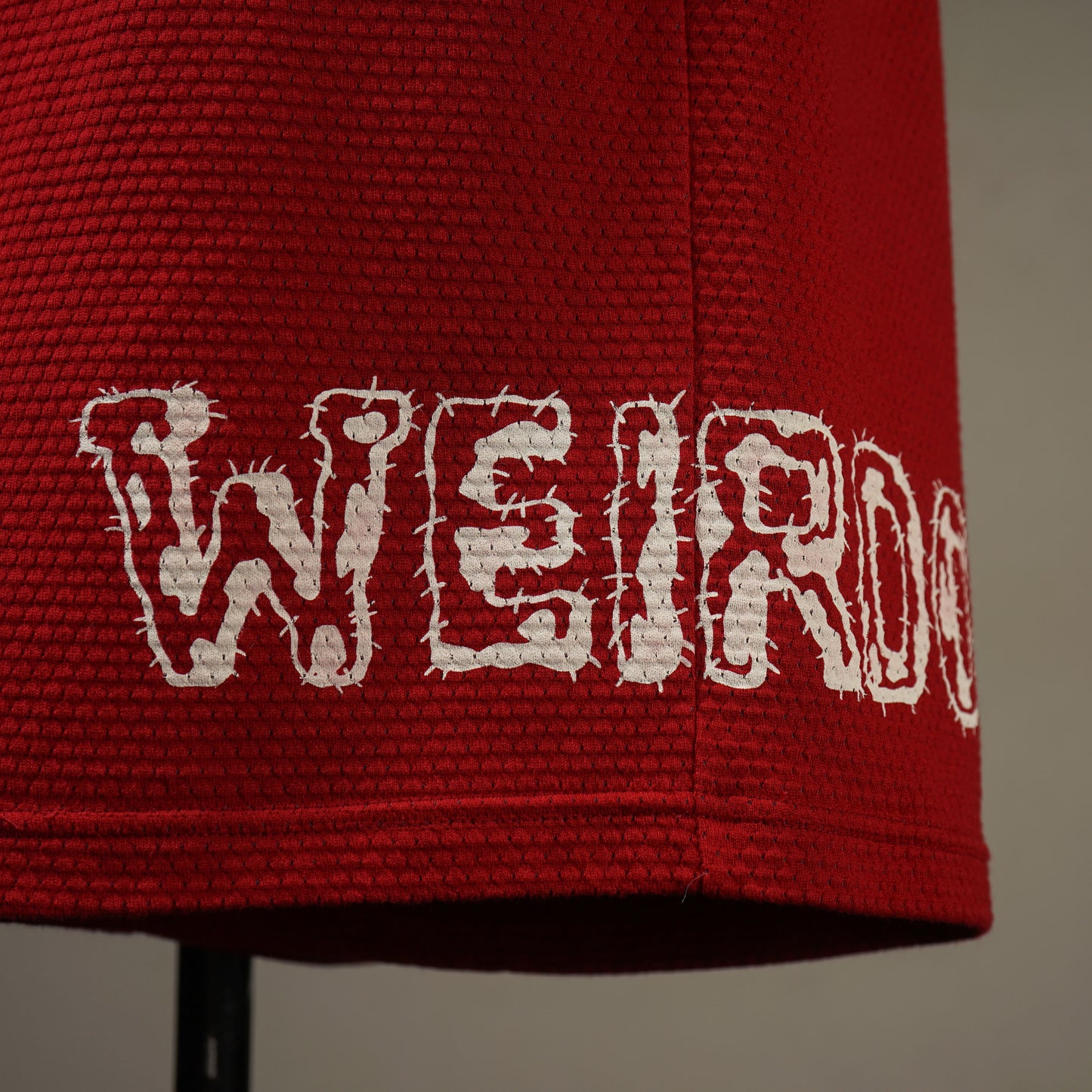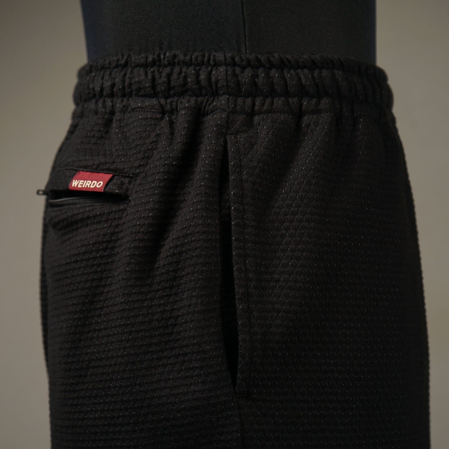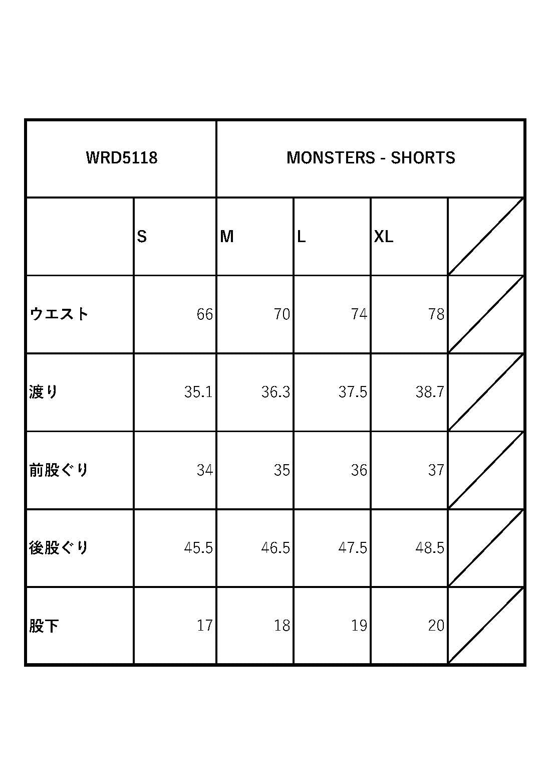 ワタリや裾幅にゆとりを持たせ、丈もやや長めに設定したリラックスシルエットのイージーショーツで、脇に配されたグラフィックがポイントです。禍々しく毛の生えた文字がモンスタートイを思わせるチープでマニアックなグラフィックデザイン。