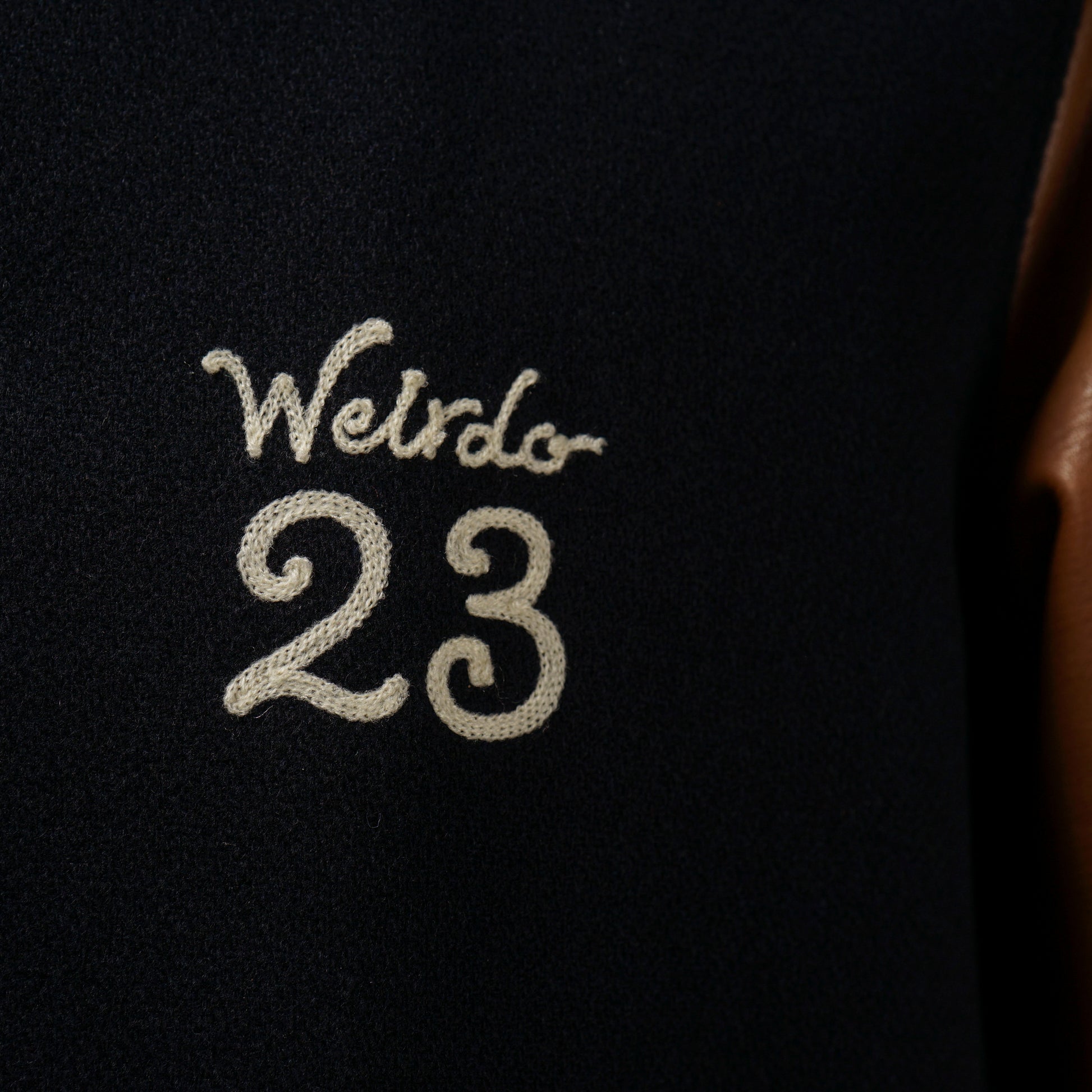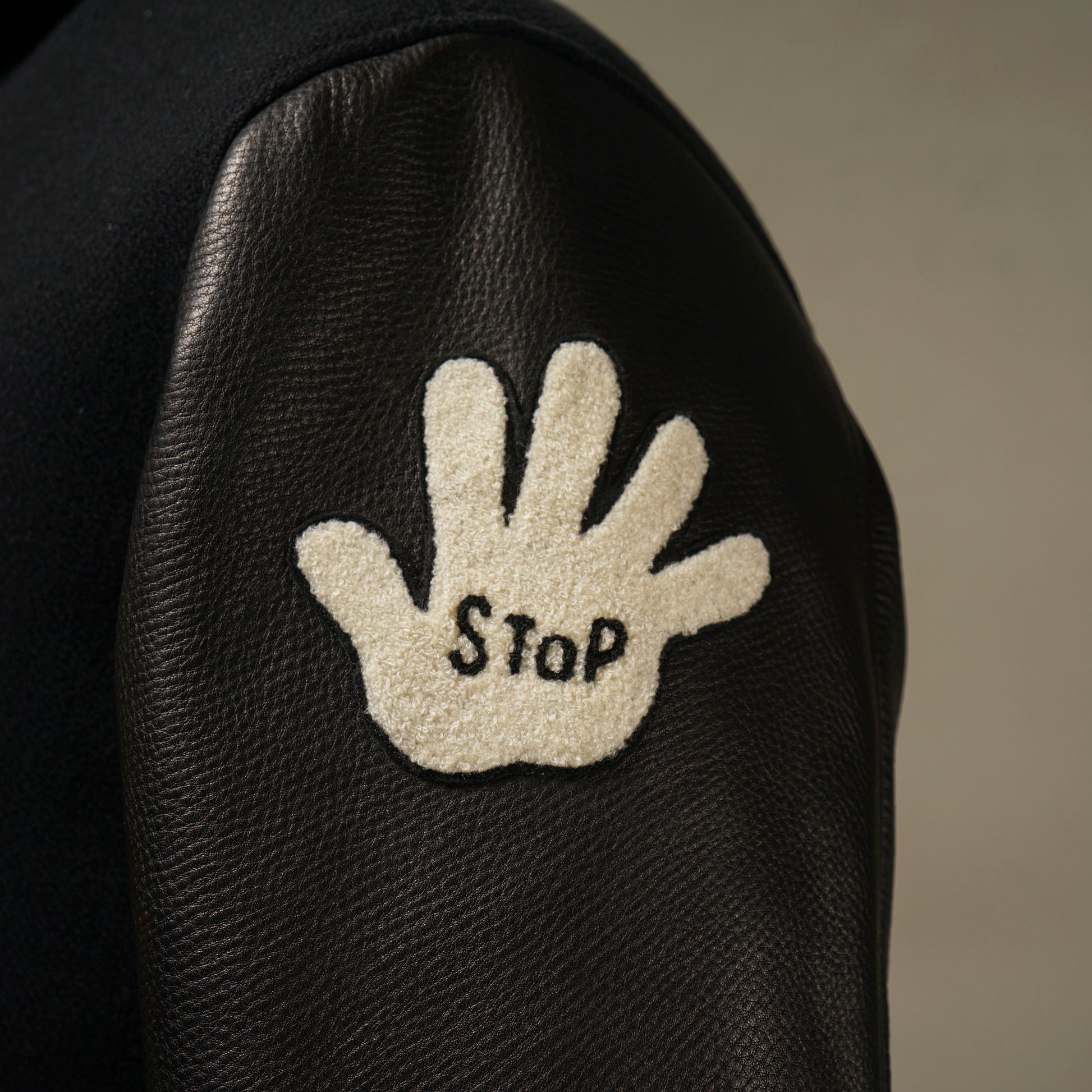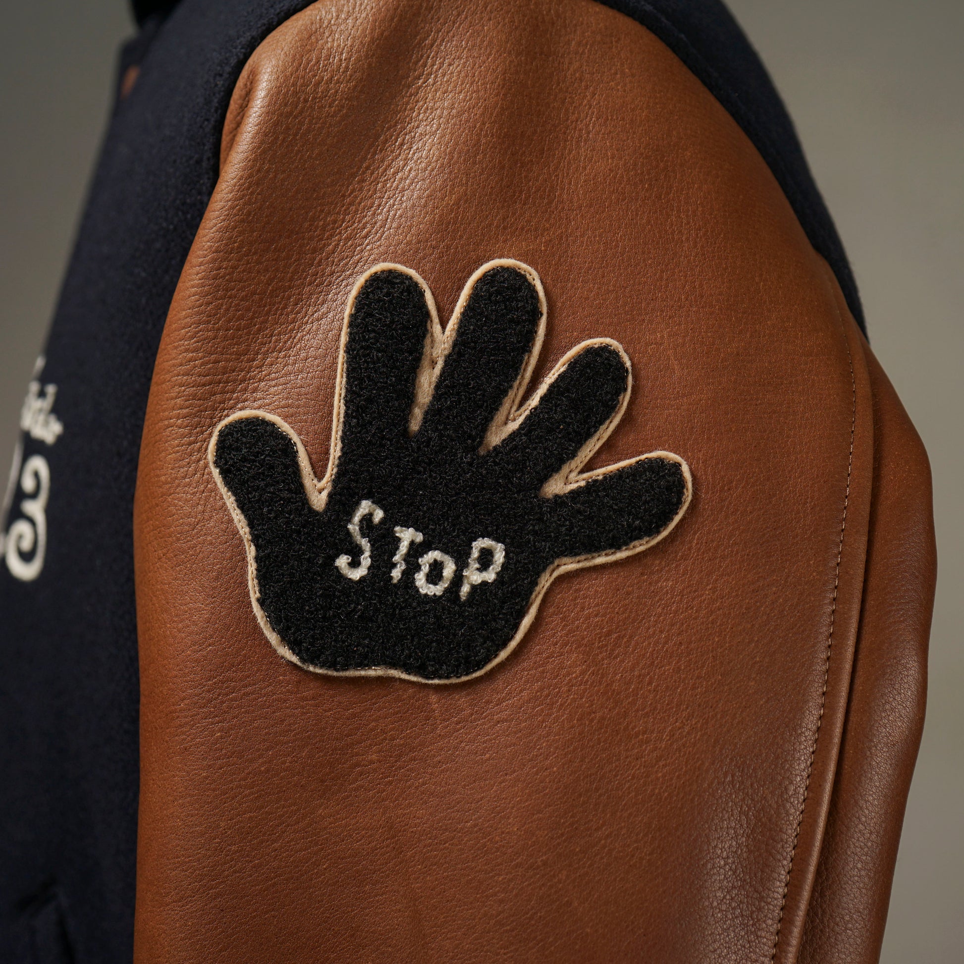 ラウンド衿が特徴的なスタジアムジャケットで、胸、背中、腕に配されたサガラワッペンやフェルトパッチ、チェーン刺繍で表現されたモーターカルチャーを感じさせるグラフィックがポイントとなっている。