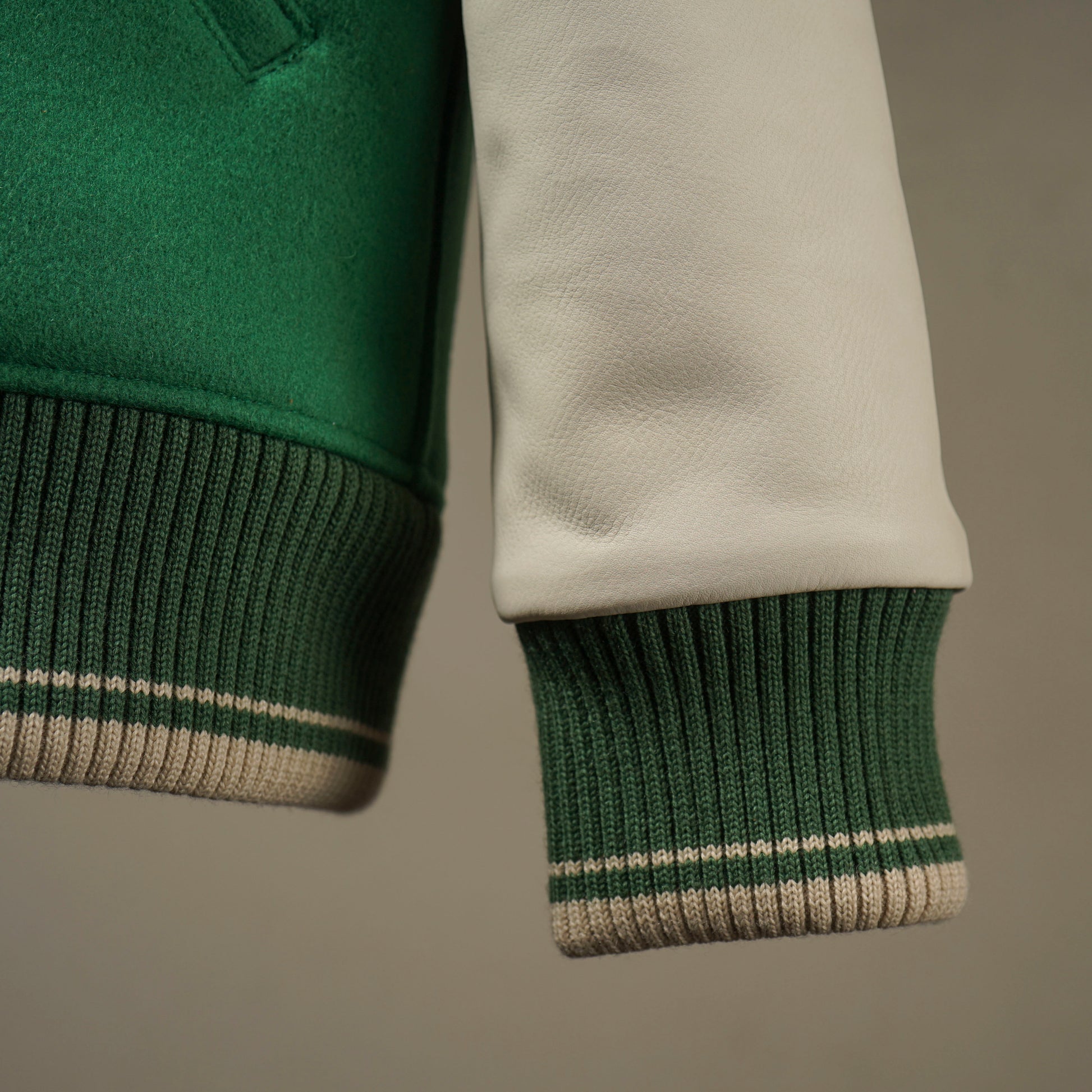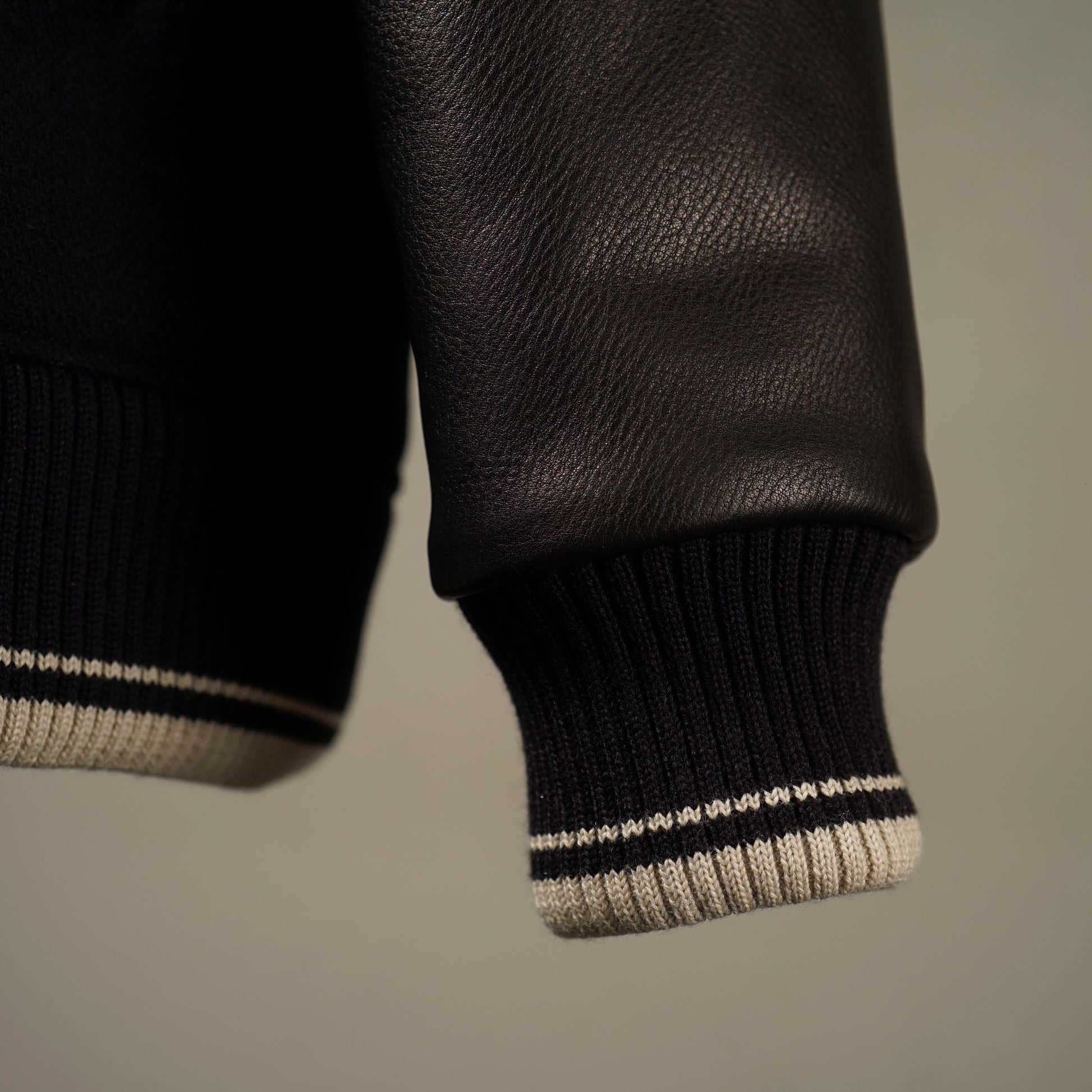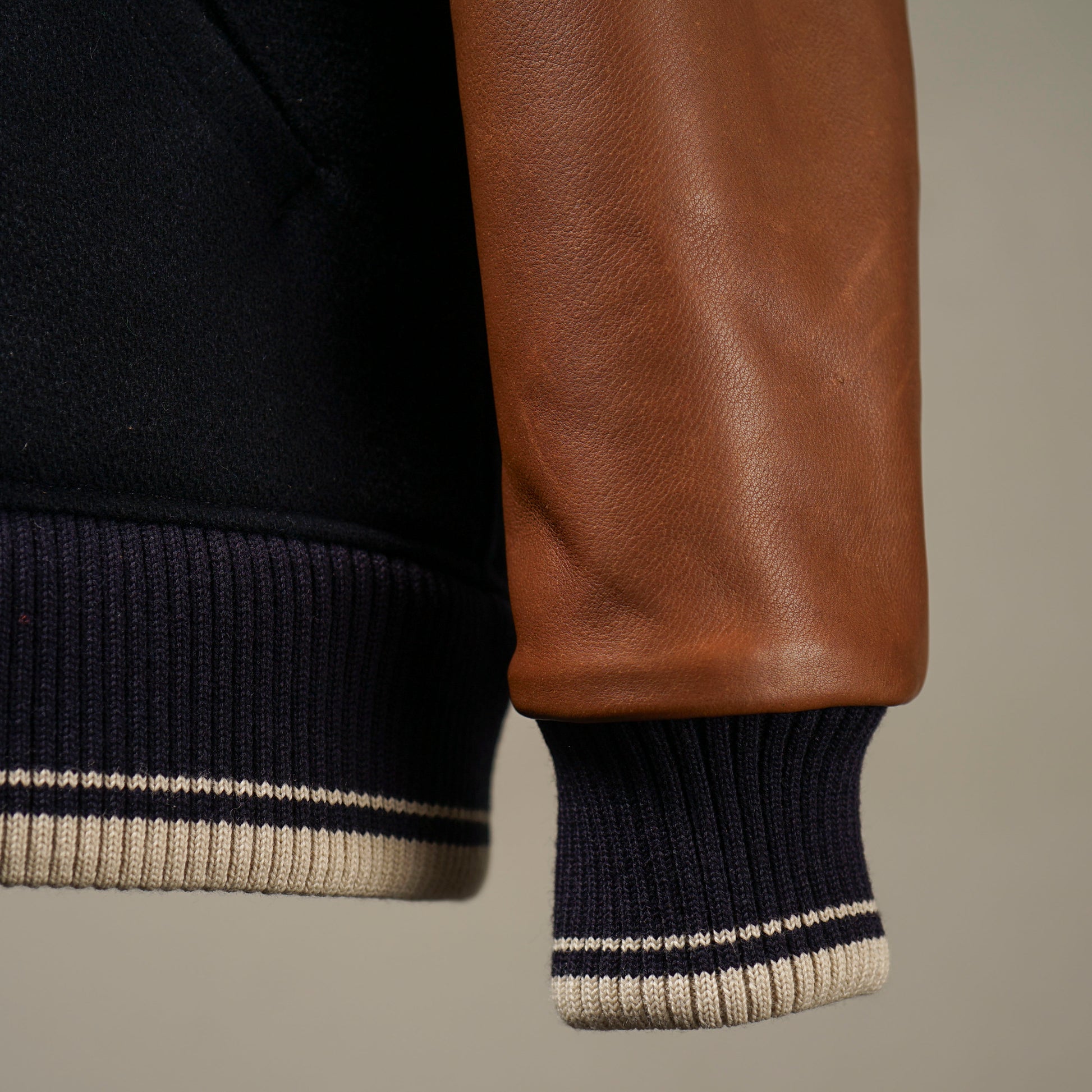 乾いた粗野な雰囲気でヴィンテージライクな二重織ウールメルトン、袖のレザーにはふっくらとした質感と、シボ感が特徴のステアハイドを採用。