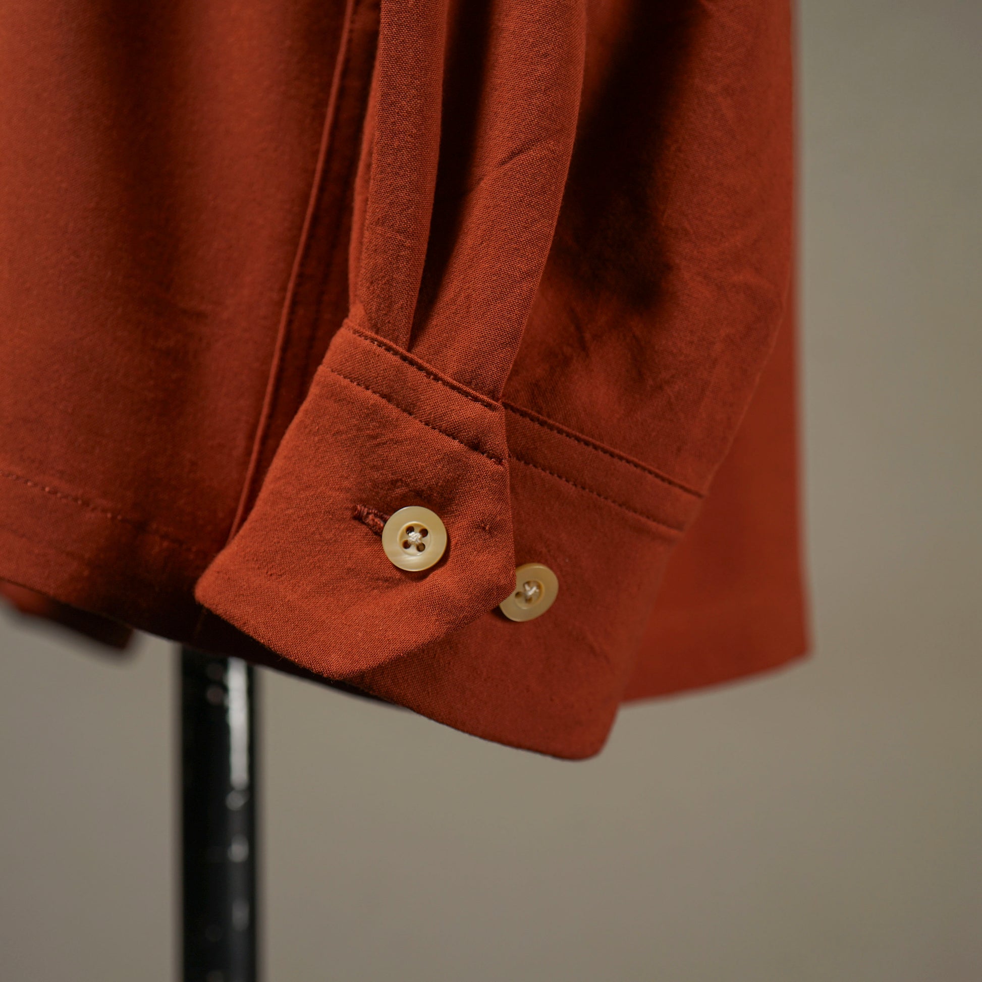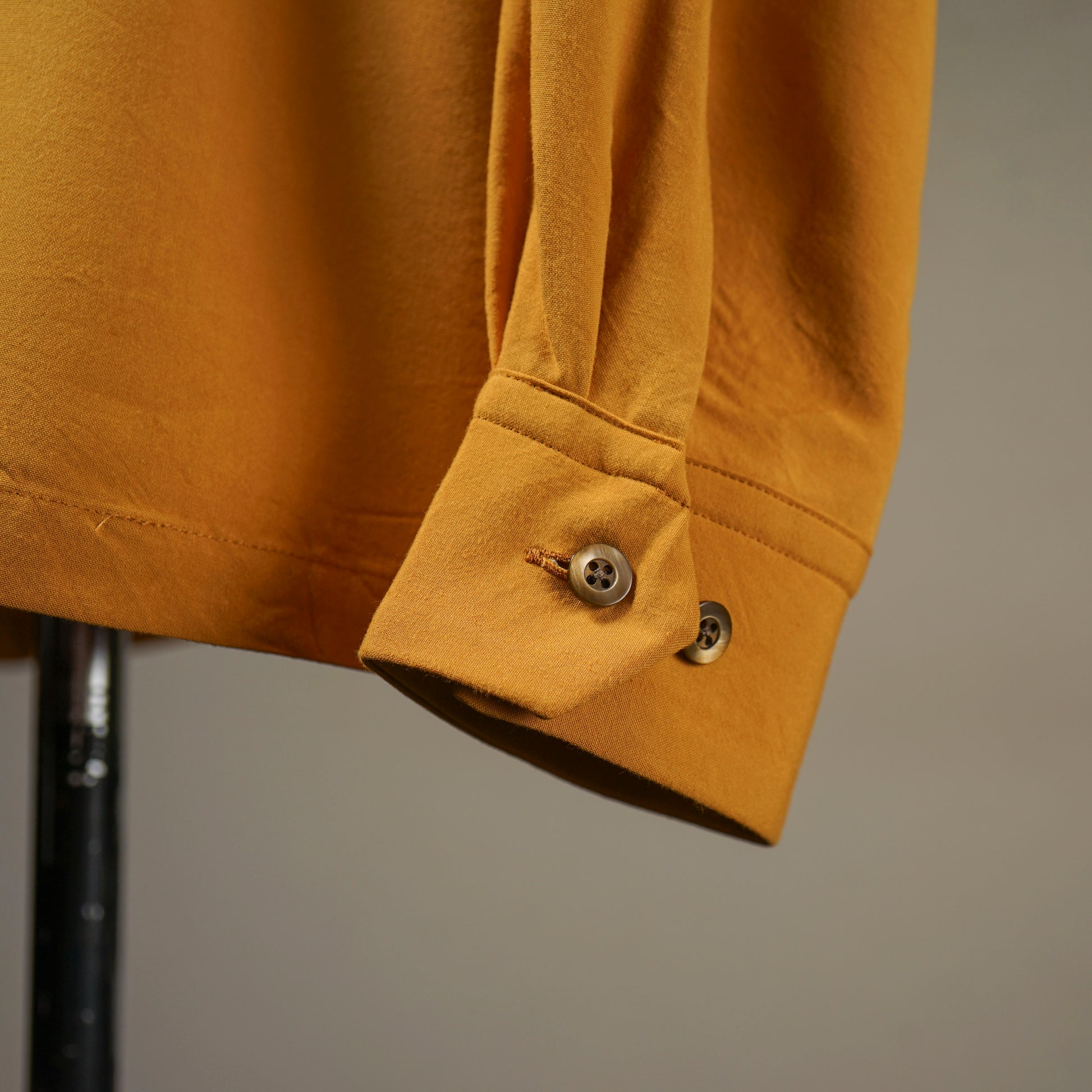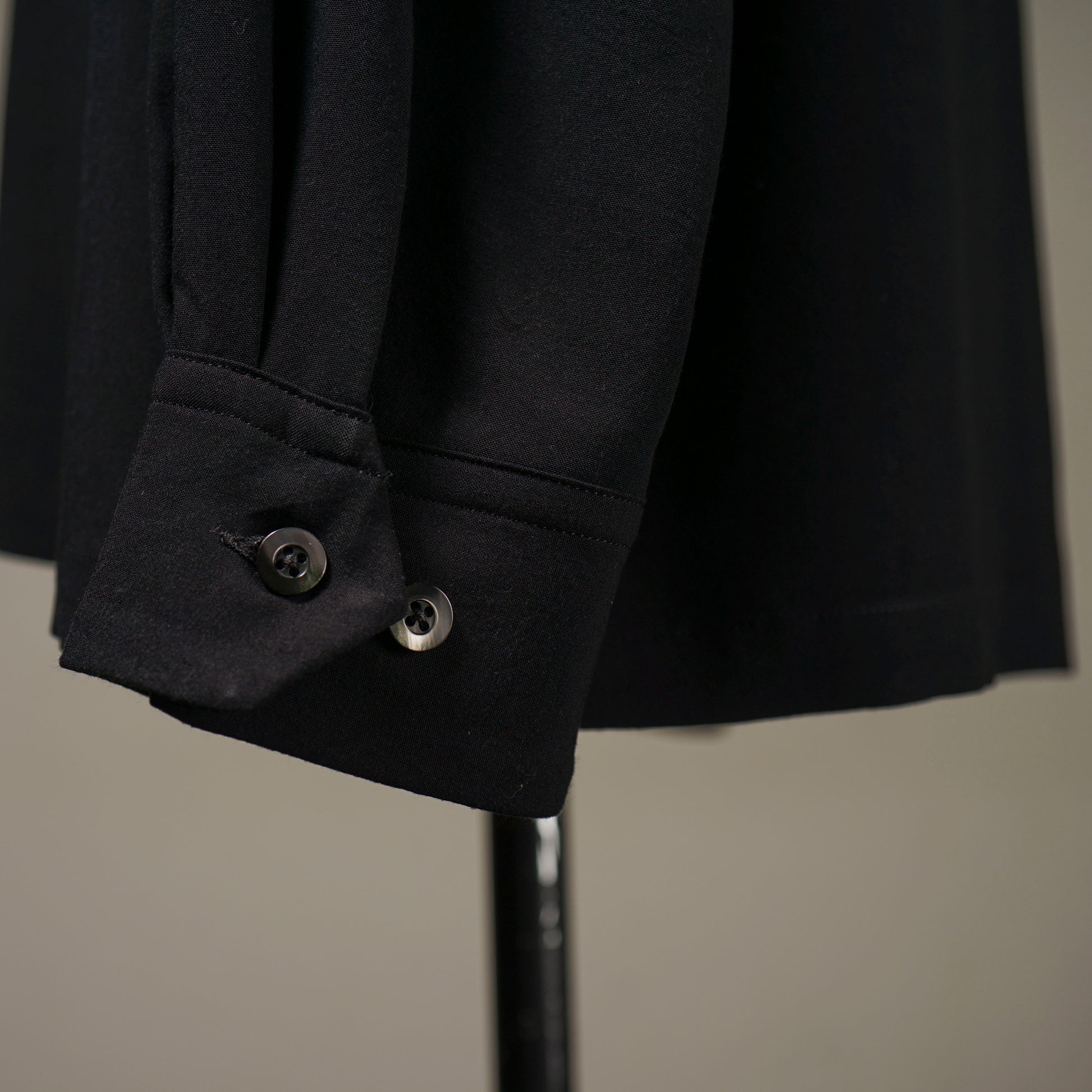 シルケット加工を施し、豊かなドレープの中にわずかなシャリ感を持たせた他にない生地感に仕上がっており、着用時の豊かな肌ざわりと清涼感を感じて頂きたい生地となっている。