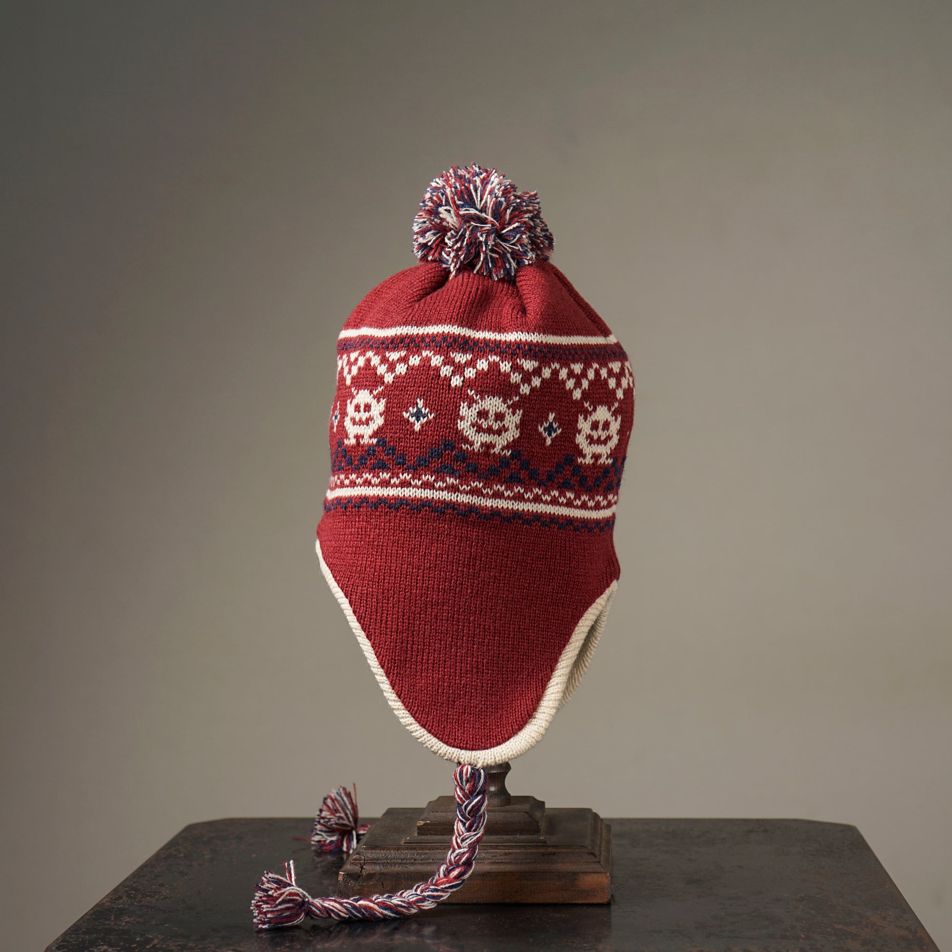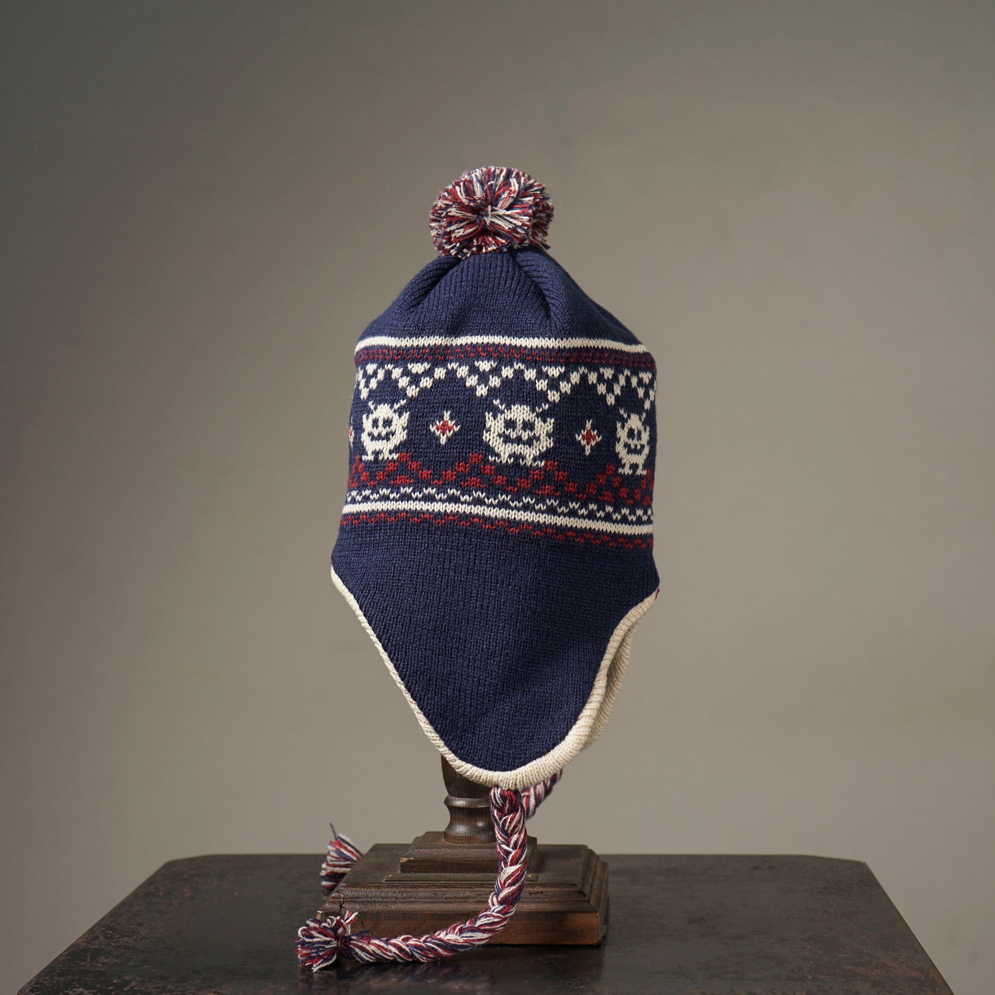 怪しげな姿のクレイジーなエイリアンをヂャガードで表現した使い勝手の良いアクリル/ウールのヂャガードニットのイヤーマフビーニー