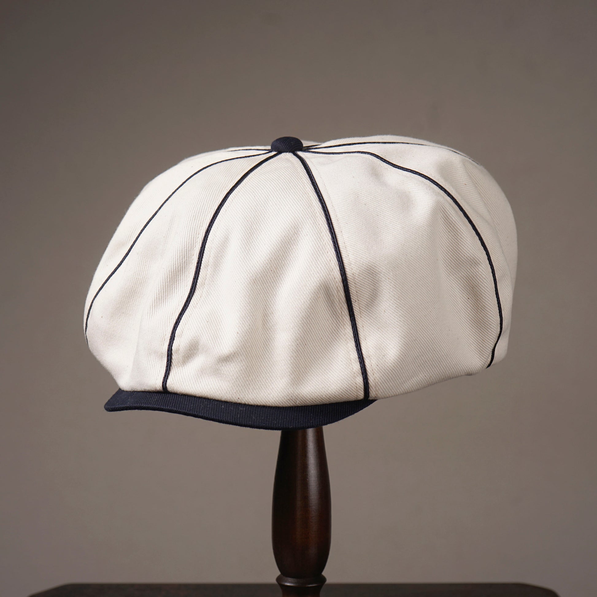 肉厚で耐久性の高いコットンカツラギ素材を使用、ツートーンカラーと配色のパイピングが特徴的でクラシックでいて遊び心の効いたキャスケットです。